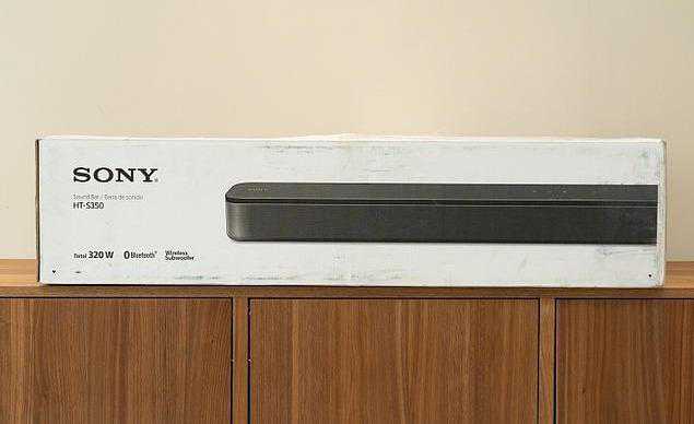 SonyHT-S350单件式家庭剧院的外箱包装,与之前测试过的家庭剧院组合相同,外箱上也可以看到Sondbar音响的实际产品照片。