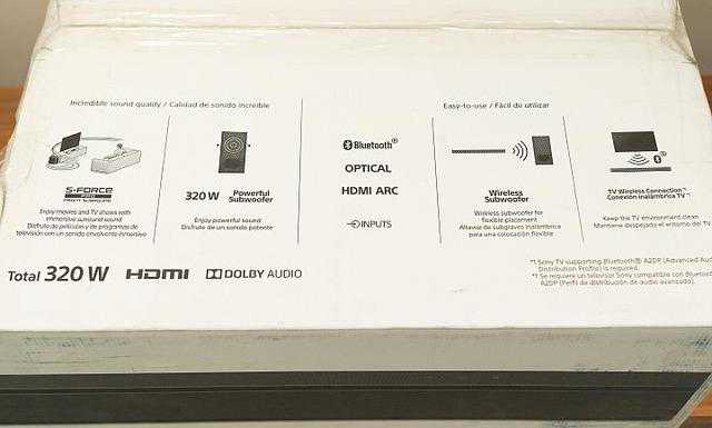 外箱上也印有这款家庭剧院的功能特色,包含具备Sony独家S-ForcePro前置环绕声场仿真剧院式环绕音效、总共320W输出功率、有线与无线蓝牙连接、无线重低音音箱,以及支持内建蓝牙传输功能的电视无线连接功能,与先前推出的HT-S200F产品连接方式相同。