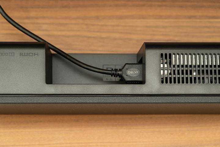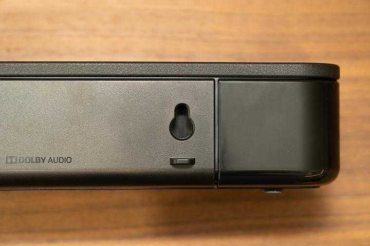 主机后侧也备有标准壁挂孔,可让使用者搭配居家风格进行壁挂摆放,内建的I/O端子埠则仅有简单的HDMIARC端子,以及数字光纤输入插孔。