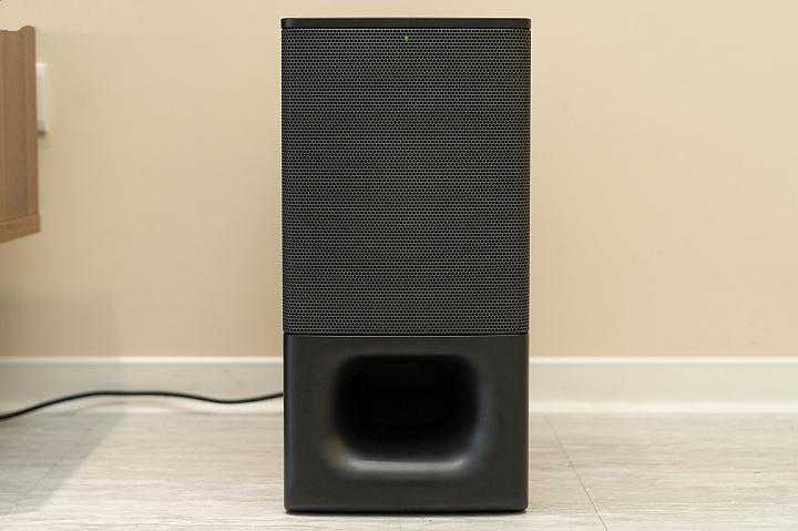 HT-S350比起HT-S200F增加了一个独立的无线重低音音箱配置,组成标准的2.1声道喇叭系统,音箱尺寸为19(宽X高X深),内建16cm大型喇叭单体与28声量音箱,音箱下方也可以看到大型的低音反射孔配置。