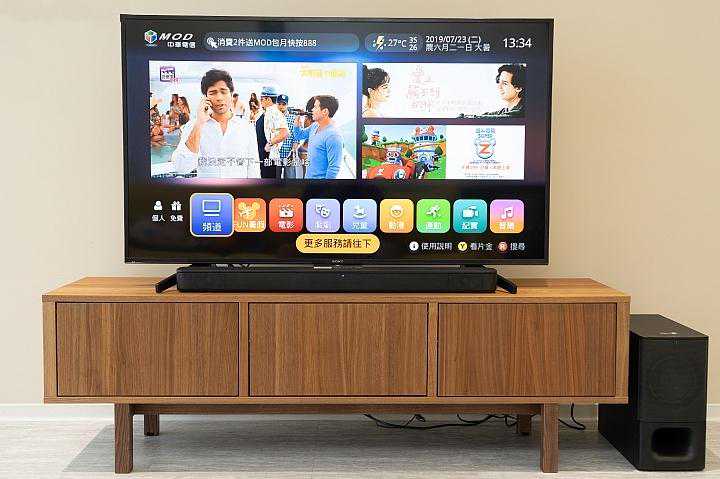 为了搭配SonyHT-S350单件式家庭剧院,小编也顺便借来Sony本家的BRAVIA55X7000F电视来进行搭配,主要的摆放方式与配置如照片所示,提供给各位参考一下,至于电视柜下方的杂乱线材就请自行忽略。