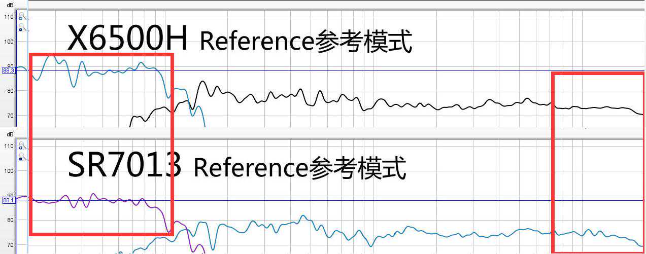 马兰士SR7013的低间炮通道也是88dB的同均声压,但马兰士的MEQXT明显把低音炮通道的曲线压得更平,同时还让高频衰减得更早一点。