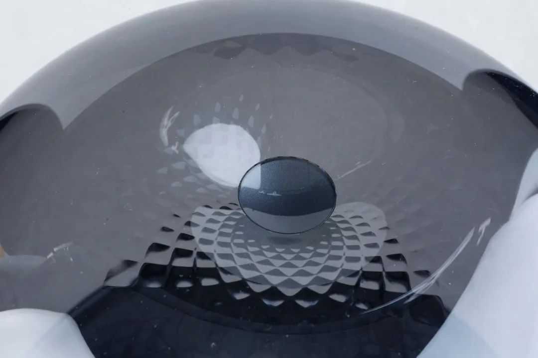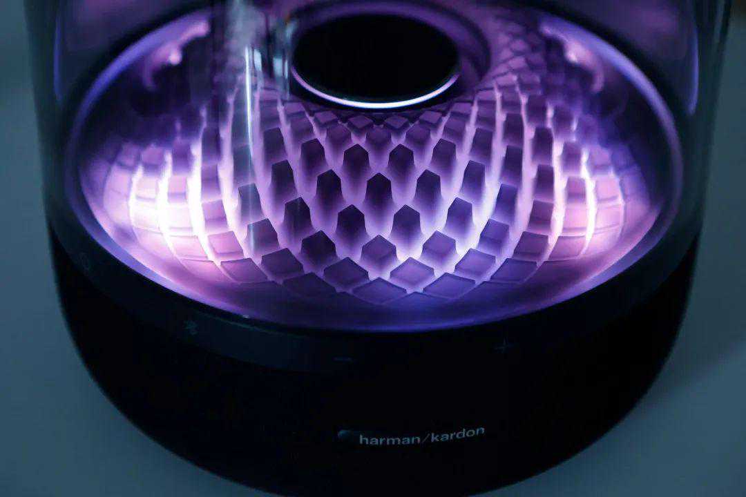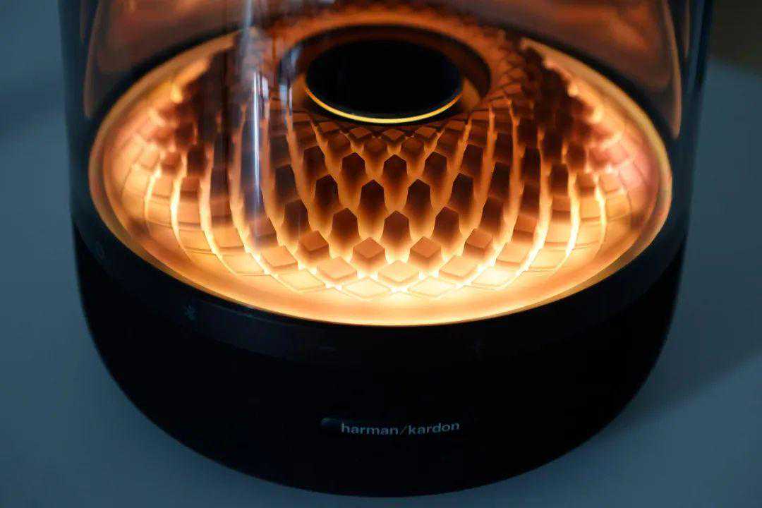 相比上代产品,音乐琉璃四代在外观上最大的变化来自“水母罩”内的元素设计。音乐琉璃系列每代产品的亮点之一就是这部分的造型与光影变化,从涡轮状叶片到水波纹,每次造型与光影效果的改变都会带来不一样的新意。在音乐琉璃四代上,harman/kardon的设计师引入了全新的菱形钻石纹设计——中央升起的圆盘,四周或高或低的立体钻石形成规则的矩阵。观者既能从中找到一丝身处冰岛风琴岩的孤寂感,也能捕捉到如科幻电影里快速变化矩阵的影子,一静一动之间,呈现出一种凝固的动感。