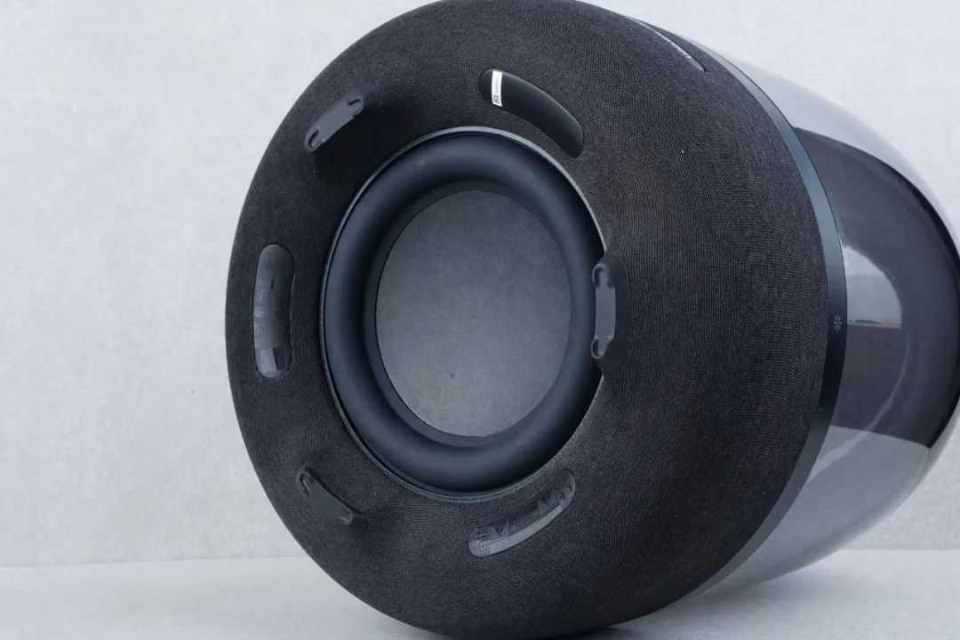 音乐琉璃四代的扬声器集中在箱体下部,由1个130mm低音炮和6个40mm中高音扬声器组成。扬声器的排布方式充分利用它圆柱形的箱体,低音炮采用下沉式设计,将箱体抬起来便能看到它,大口径加上100W的额定功能赋予了它澎湃的低频能量。6个中高音扬声器围绕音箱以对称、等距的方式布置,使得其周围空间的指向性无死角,形成了360°环绕立体音效。