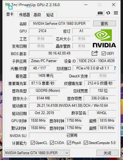GPU-Z已经可以识别到索泰的这张GTX1660Super,但因为软件数据库需要更新等原因并不能显示工艺等小部分数据。GPU基础频率为1530MHz,索泰给这张卡设定的Boost频率为1815MHz,比官方的1785MHz略高。显存为镁光的GDDR6,容量6144MB,带宽336.0GB/s。