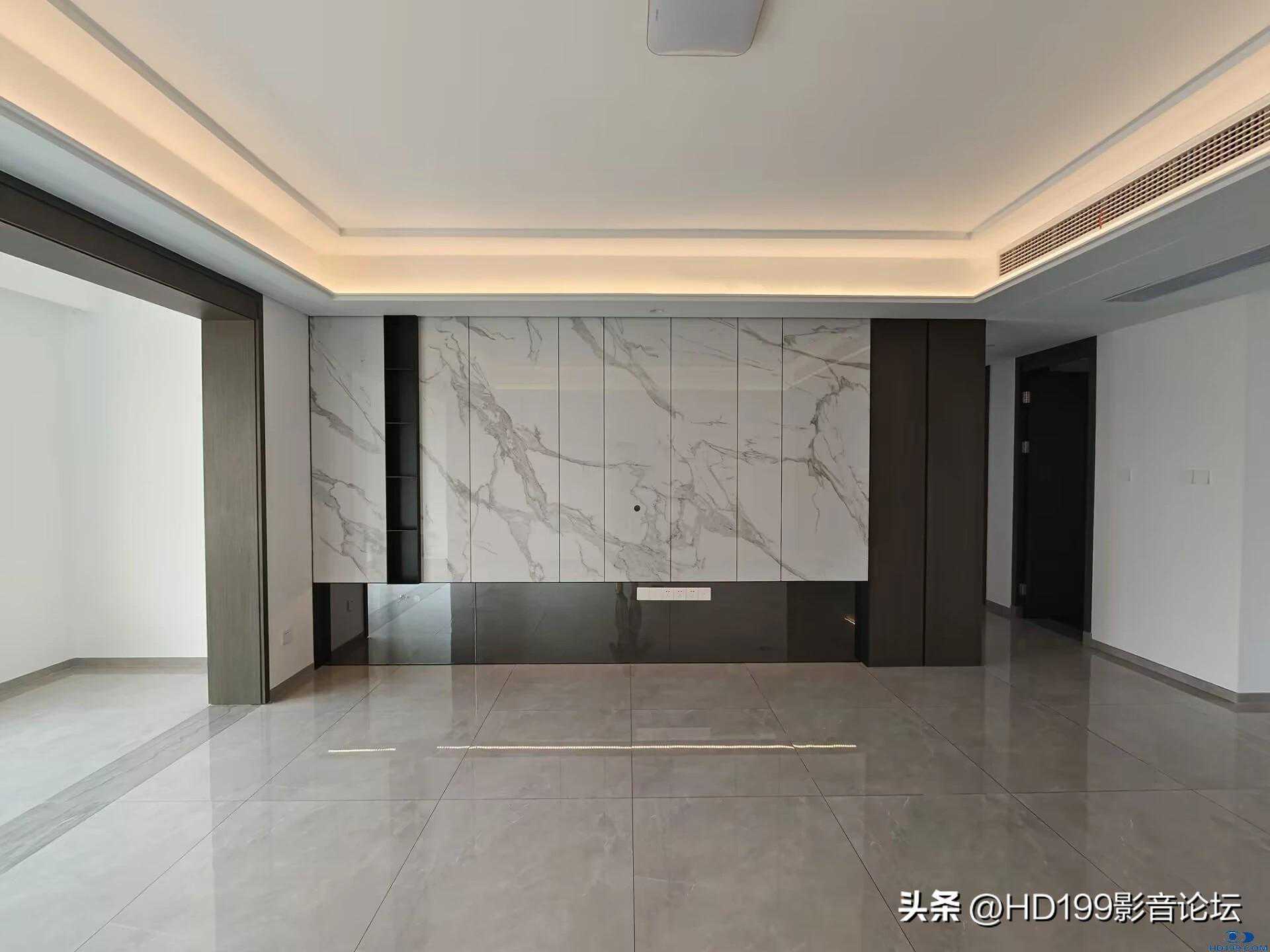 电视墙侧舍弃了电视柜,只保留3只音箱,全部落地会显得很奇怪很空,同时三只音箱的线也会裸露在外,于是做了一个8公分高50公分宽的岩板地台。把三个音箱放到上面,提升了中置的高度,并且三只音箱的音箱线可以从地台内部走线,线材完全隐藏。PS:有人说音箱靠墙不太行,还好jblL880导向管在前面,这个不会影响到。