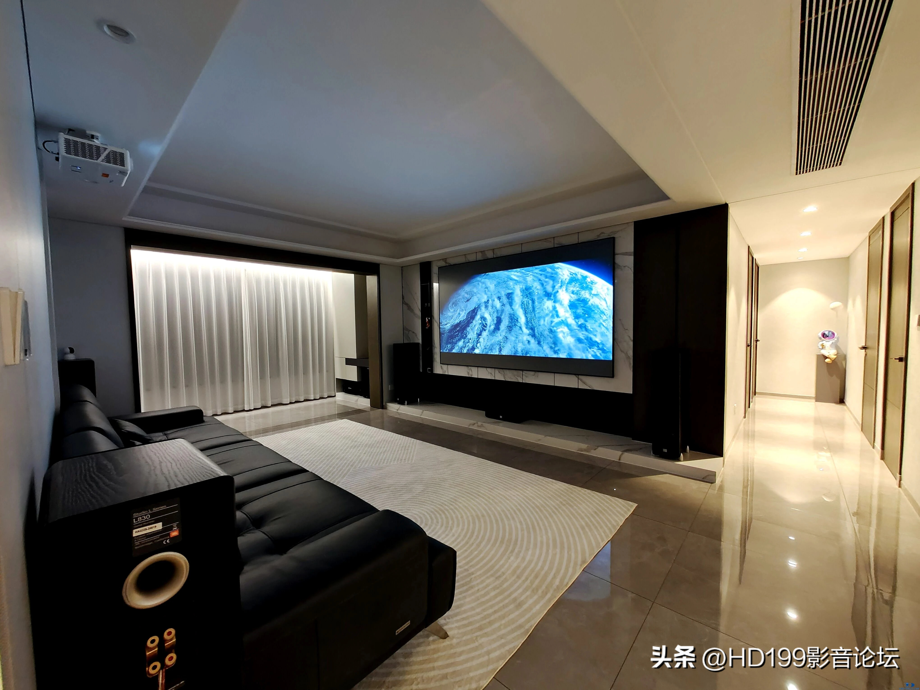 最后说一下器材吧,投影用的是奥图码UHZ716,激光光源账面参数3000流明,同时加中长焦菲尼尔幕布的抗光和增益,白天观影无压力(别抬杠,只是说能正常看,不会说达到小黑屋那种效果,晚上看堪称完美)。菲尼尔幕布灰色材质也能提升黑位,真的有液晶电视的感觉。但是也有缺点,为了上电梯选的软幕,平整度还是差一些,不平的地方有一点暗影,影响不大,如果电梯可以放得下还是选择硬屏才好。箱子用的JBL880+LC1+L830,炮LS120P,功放天龙X4500H,播放器海美迪Q5plus+8T硬盘,够用了。120寸看惯了真不觉得大,可以说一点都不大,我觉得客厅也就这样了,如果说弄顶天立地的幕布那需要横厅,而且现在菲尼尔幕布最大尺寸好像也没有那么大。还有就是菲尼尔无法做成透声幕。这里应该有大神说你这个箱子应该上后级。。。。我依旧妥协了,不折腾了,如果再折腾,下一次应该会弄个单独的影音室。