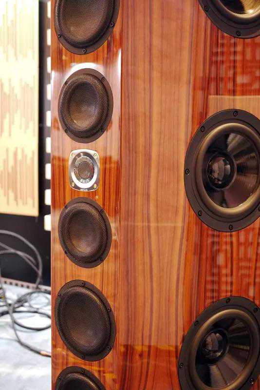 在经历了2年多的研发,VentureAudio推出了最新的旗舰GrandExtremeLoudspeakers有源音箱。也是有源产品线的参考级扬声器。这套大型扬声器每声道配备了13个喇叭单元,由一只32mm铍高音喇叭单元、两只5吋CFGC碳纤维石墨复合材料中音喇叭单元、四只7吋悬挂式CFGC中低音喇叭单元以及六只10吋CFGC超低音喇叭安装于侧板。