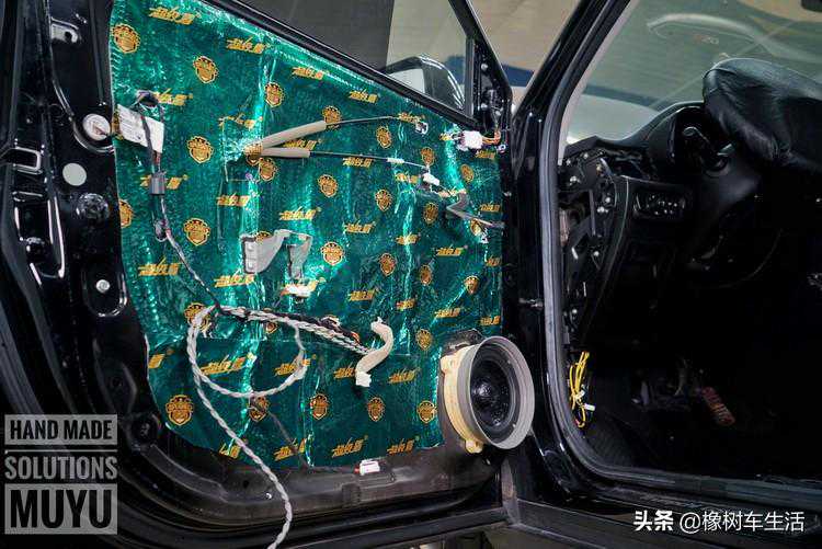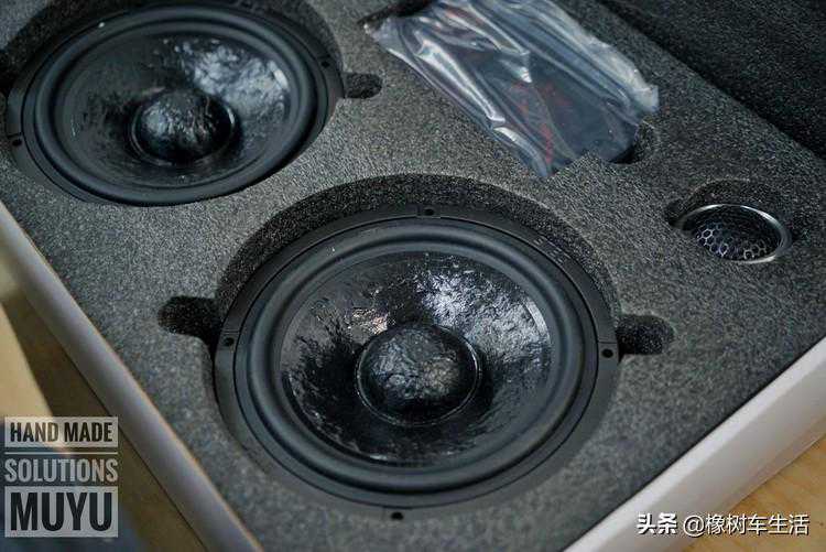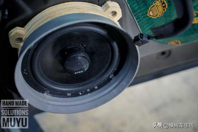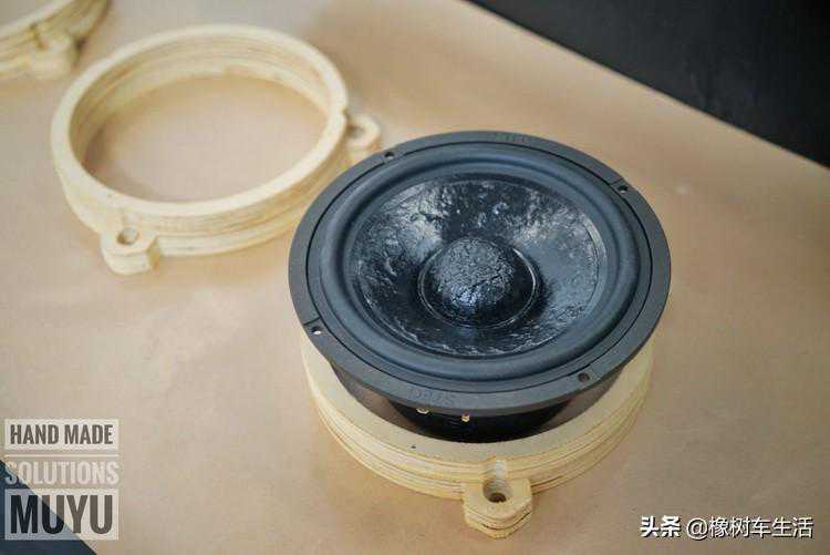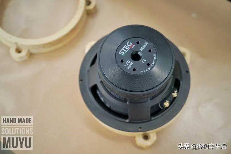 更换喇叭之前先使用大能隔音材料,对汽车门板做了隔音处理,以降低门板共振对喇叭的干扰,使喇叭有一个良好的工作环境。前声场喇叭升级为意大利史泰格ME650CII套装喇叭,它的中低音单元使用了经典的松压纸质音盆,让中低音部分音色饱满。醇厚,独具韵味;高音单元使用了高端丝质振膜,让高频部分自然通透。后声场搭配一套意大利史泰格MS650同轴喇叭可以让声音的听感更加丰满立体、现场感强。而为了让喇叭能够发挥最佳表现,改装技师为喇叭制作了木质垫圈。