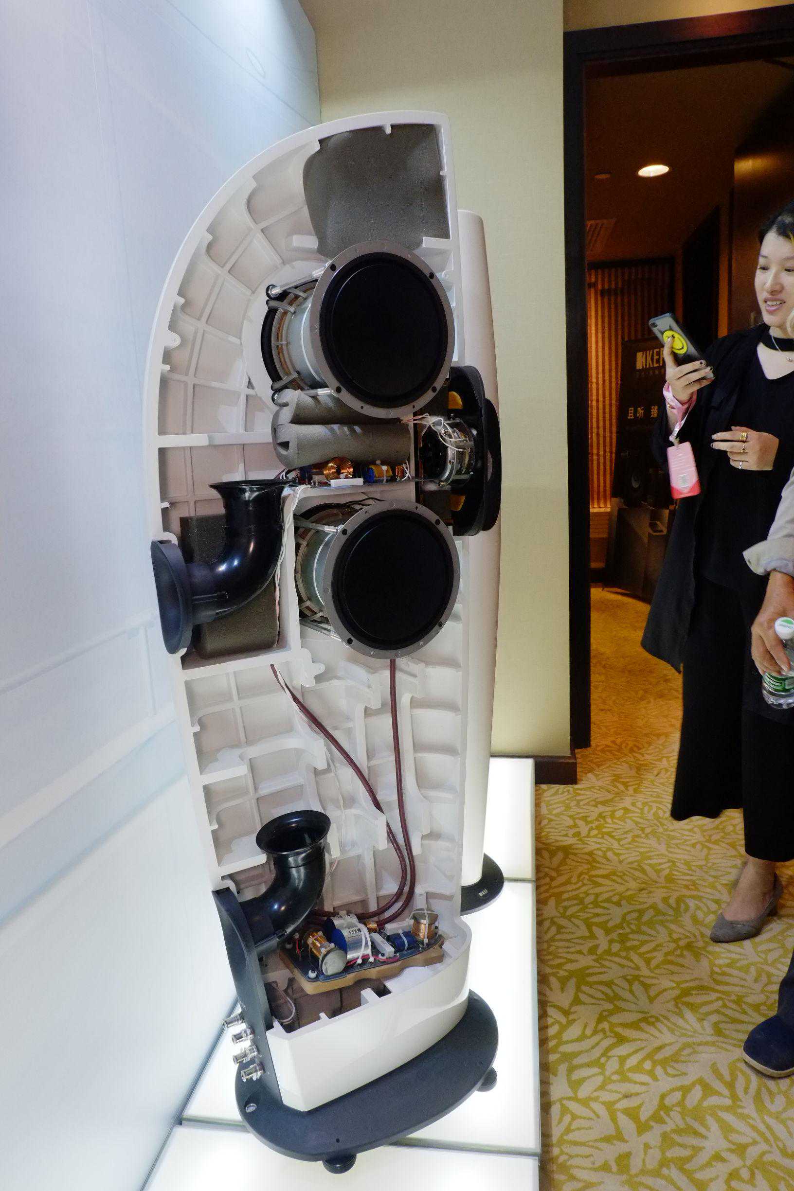 来自新加坡的新晋品牌创世纪品牌展出旗下音箱产品,从腔体到脚架均为全透明设计,小小的尺寸能量感颇强。