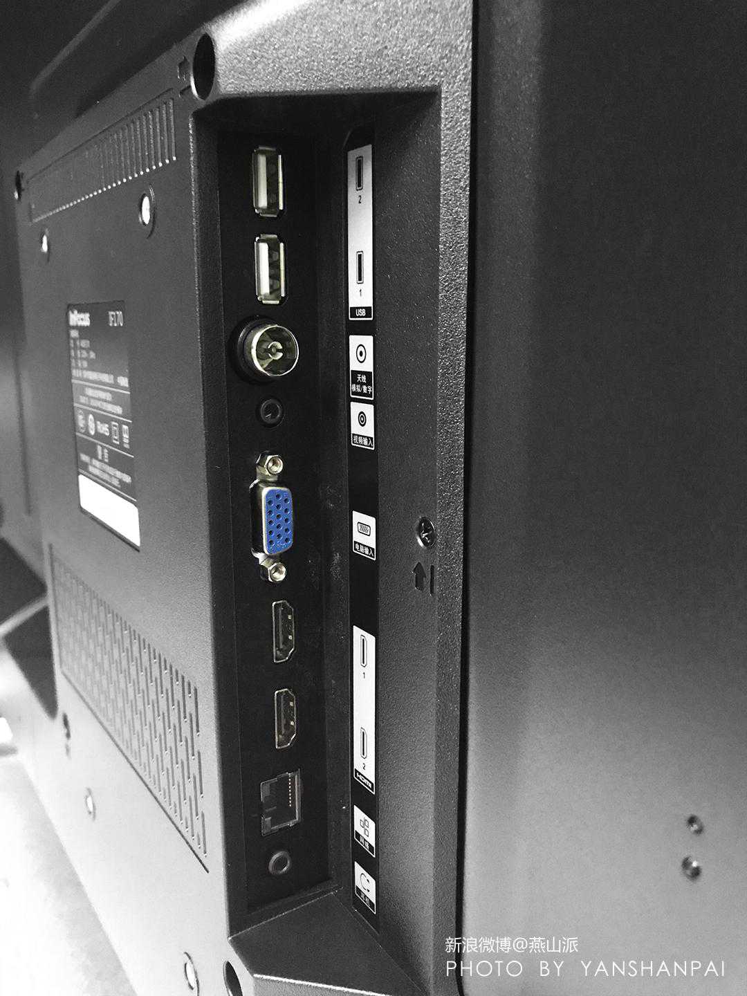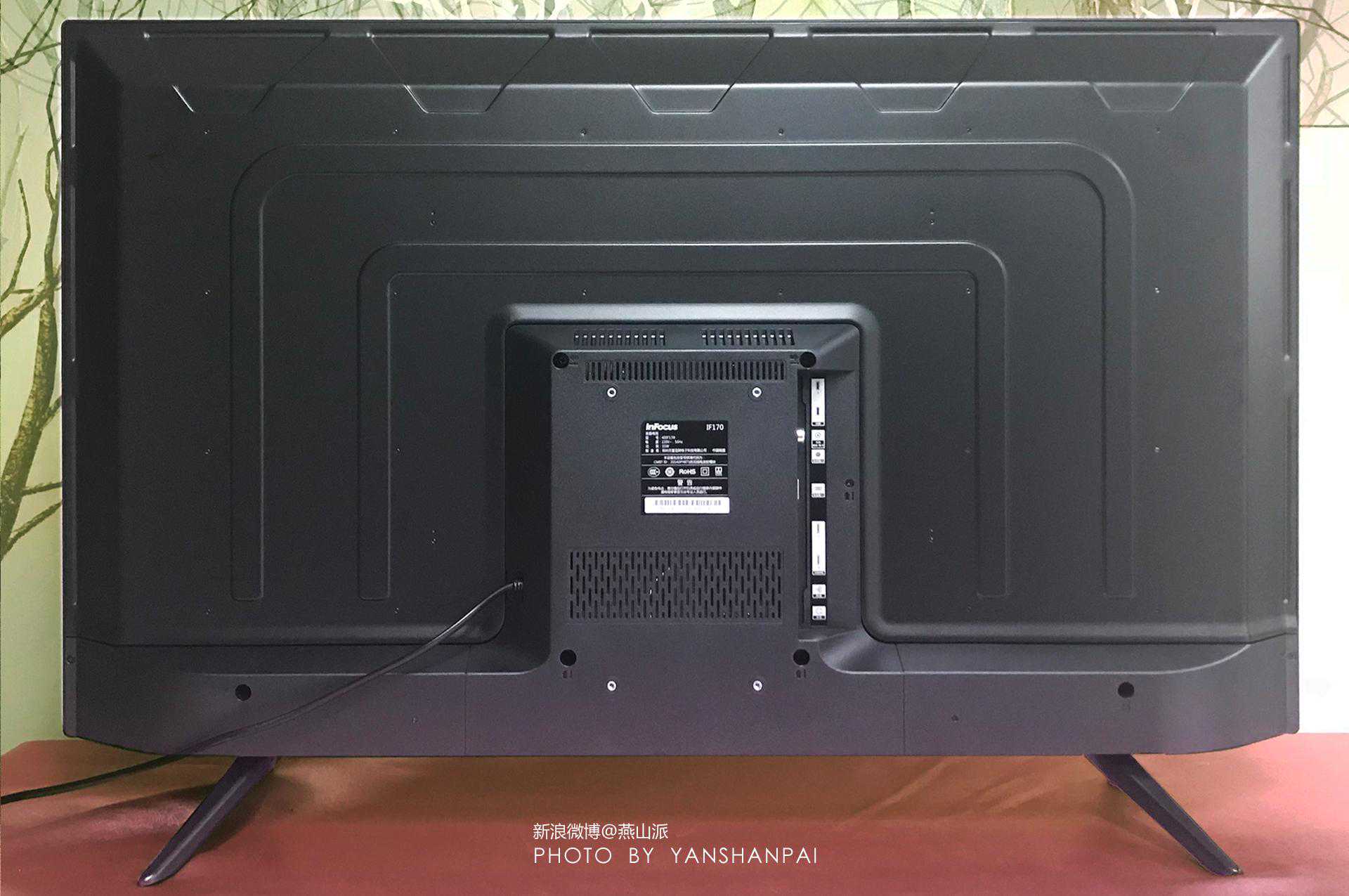 值得一提的是,InFocus富可视40英寸电视新品的借口配备非常丰富,2个USB口、2个HDMI口、1个网线接口、1个音频输出接口、1个AV输入接口、1个VGA电脑输入接口,还有一个天线/有线电视接口。