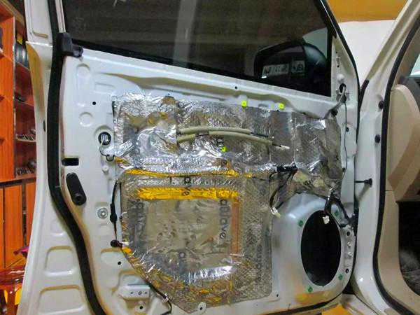 巡洋舰拆开门板内部已有一层塑料防尘罩撕掉防水膜,用干净的毛巾擦拭干净,然后再做隔音车门隔音处理之后车门钢板上的孔洞被隔音材料完全密封了,使车门形成了一个类似于音箱的箱体,为喇叭提供了一个更理想的工作环境,降低了因共振引起的谐波失真,声音会更干净有力