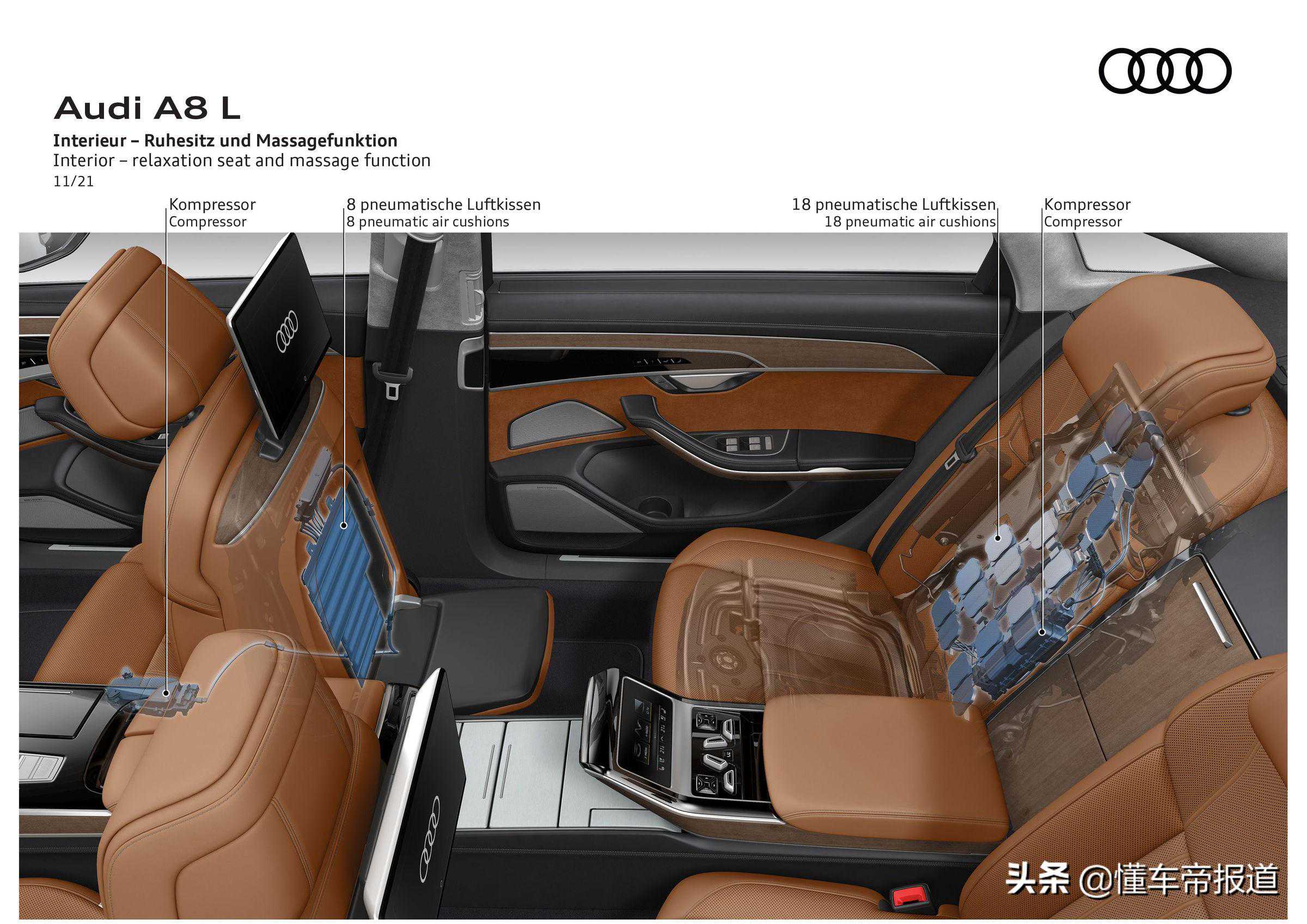 后排空间自然是其设计重点,“豪华舒适躺椅”成为全新A8家族车型一大亮点,提供多种座椅调节角度,前排座椅背面配备脚踏板,乘客可享受足底加热和按摩。“放松座椅套件”配备背部按摩功能,由18个气垫支撑,舒适头枕可电动调节。BO3D高级音响系统得以延续。