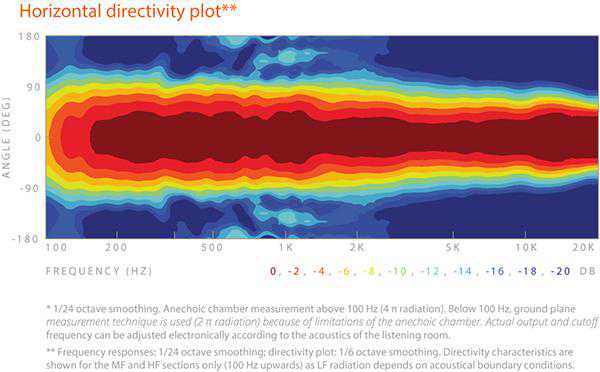前帐板则采用一体成形的ABS面板,特别针对高音和中低音单元做了导波设计,整个号角状的导波器达8吋之谱,直径与中低音单元一样。为了做这个号角状的导波器,单是前帐板的打样,就做了一千多组样版,花了两年时间才定案。最后他们还把经验写成一本技术白皮书,说明这个导波器怎么设计的。这到底有什么厉害之处呢?主要在于两点,一个是水平扩散角度更宽广,原厂提供了测试影像,显示即便离开了所谓中央的皇帝位,还是有非常平直均衡的响应曲线。二是响应平直,不影响音色。一般号角开口往往会因为声波耦合而多少造成声音的染色,因此有人称号角是「被动的扩大机」;但8C的这个号角却完全不影响频率响应,可以再生最原始的响应。