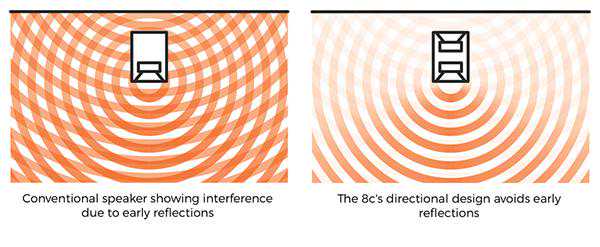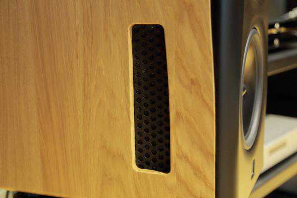 为了解决中低音单元背波的问题,箱体内部做了特殊的导流设计,称为PassiveCardioidCabinet被动式心状箱体。8C音箱两侧靠近前方位置有两个长条状开口,前有金属面板遮蔽,这不是低音反射孔,这就是这个用来导出背波的气孔。藉此设计,可以减少15dB的背波干扰。
