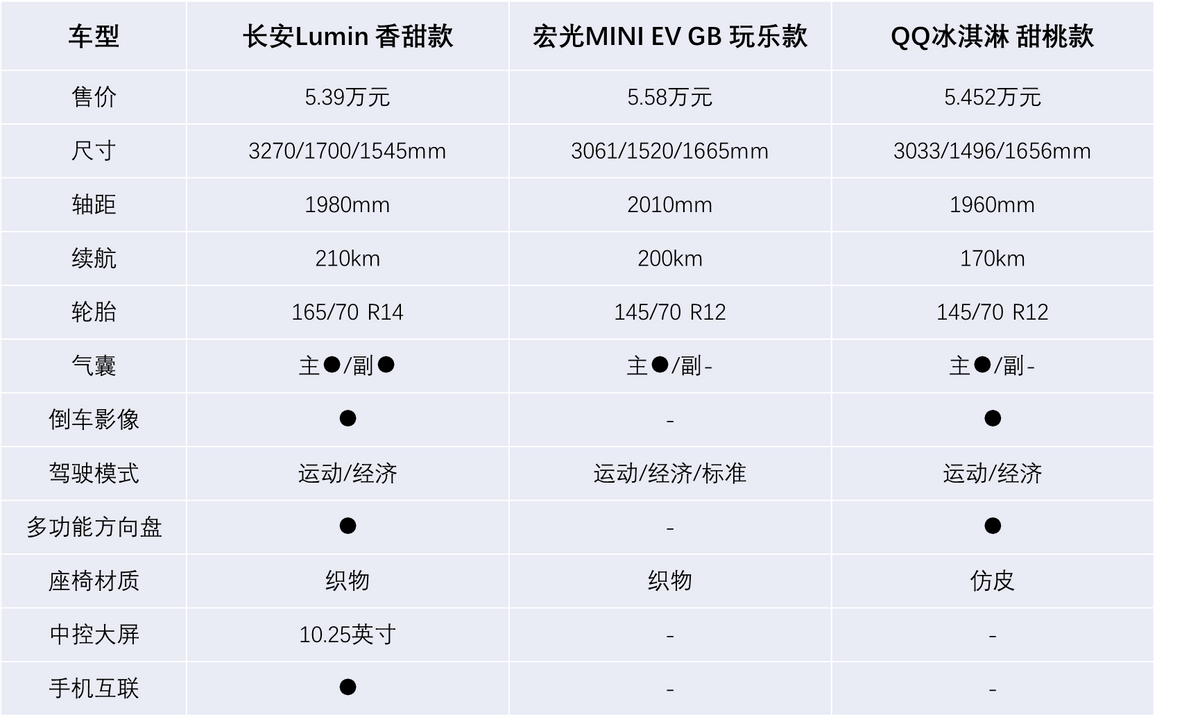 将长安Lumin主售车型210km香甜款与宏光MINIEV、QQ冰淇淋价格相近的产品进行对比,可以发现,长安Lumin不仅尺寸是最大的,续航是最长的,配置是最高的,而且价格还稍低一些,可以说是“降维打击”。