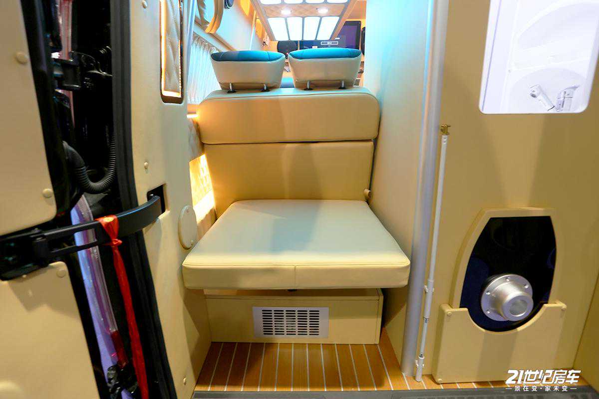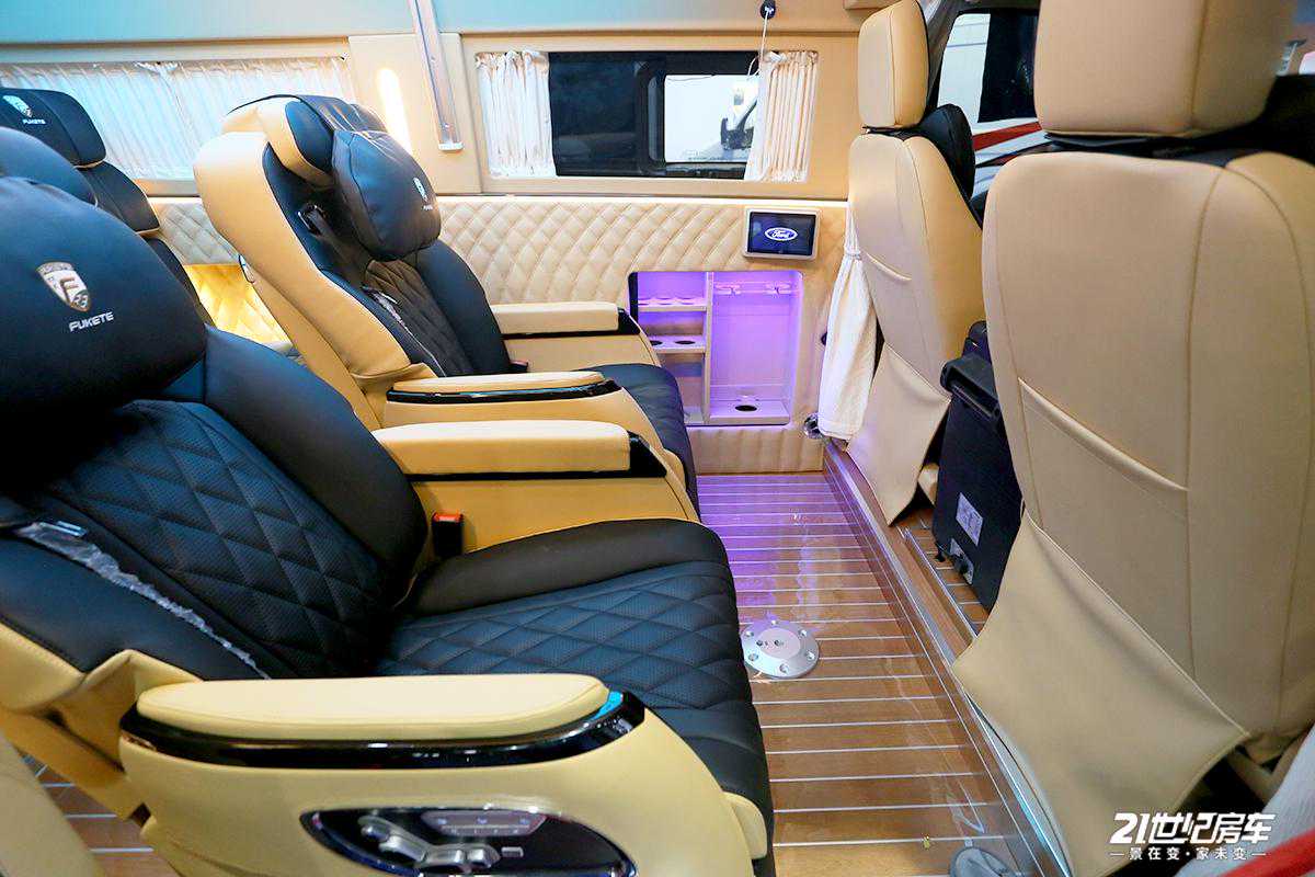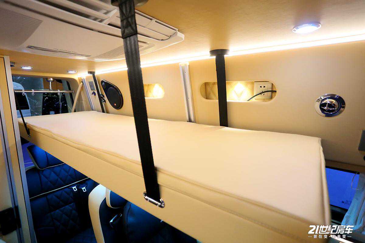 整车内饰进行了软包处理,地板为柚木实木材质;驾驶室配有中控扶手冰箱,便于储存饮品,对于夏天可及时解暑还方便拿取;上方生活区配备独立影音系统(包含内嵌式高清数字电视及JBL环绕式立体音响系统),为用户提供高品质、高画质的视听感官。车内各布局清晰,从前往后顺序依次为驾驶舱+中排两把多功能航空座椅+电动吊床+独立卫生间+尾部可拼床座椅的布局结构。