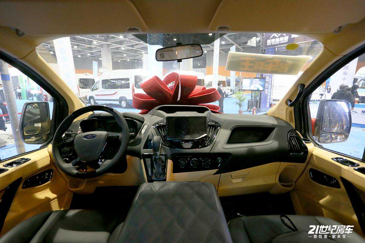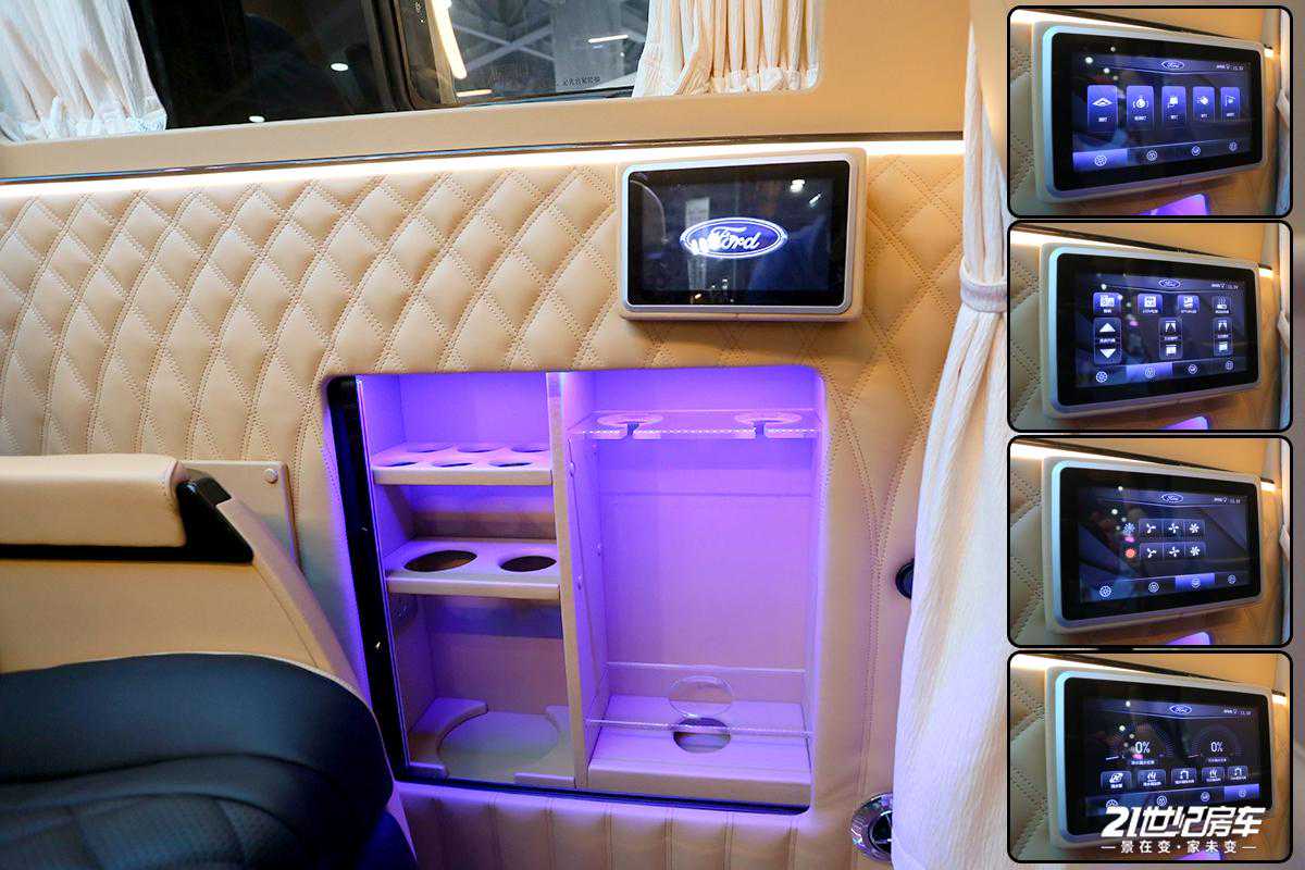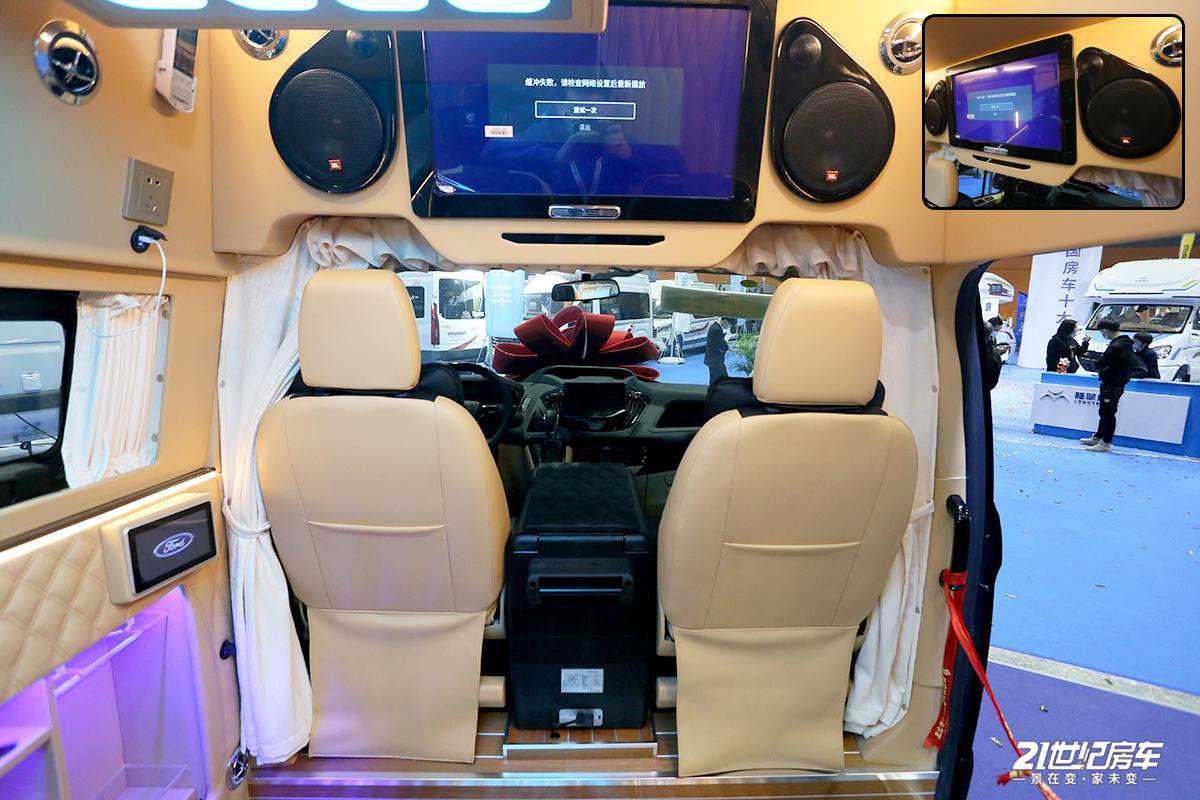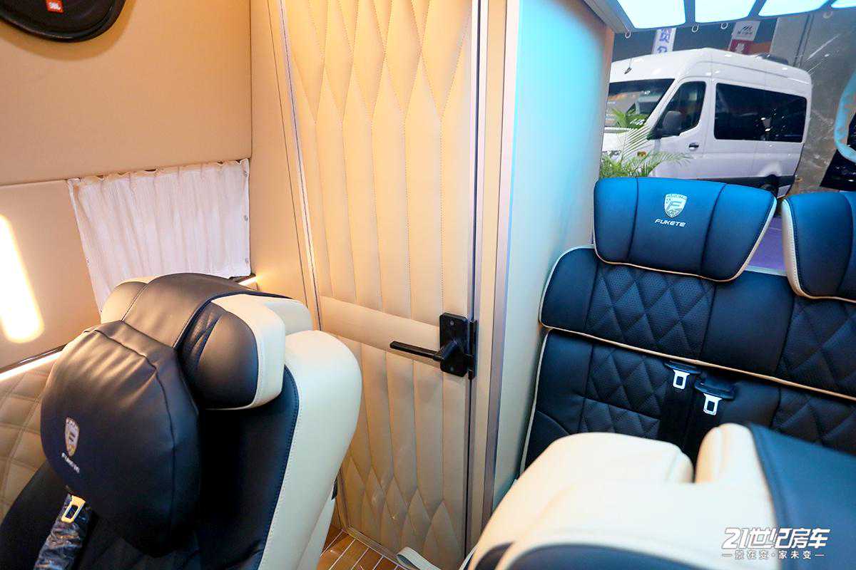 整车内饰进行了软包处理,地板为柚木实木材质;驾驶室配有中控扶手冰箱,便于储存饮品,对于夏天可及时解暑还方便拿取;上方生活区配备独立影音系统(包含内嵌式高清数字电视及JBL环绕式立体音响系统),为用户提供高品质、高画质的视听感官。车内各布局清晰,从前往后顺序依次为驾驶舱+中排两把多功能航空座椅+电动吊床+独立卫生间+尾部可拼床座椅的布局结构。