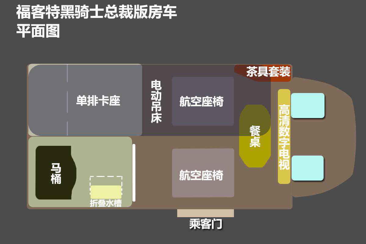福客特黑骑士总裁版房车基于福特新全顺V362底盘打造,该车长宽高分别为5500×2032×2450(mm),轴距3300mm,整备质量2860kg,总质量3501kg,油箱容积为80L。前后运动包围及侧踏彰显硬派风格的同时也极富活力,商务范十足;整车以黑色为主,车身两侧除金色拉花外,房车定制及豪华商务车的标识也极为醒目,行走在车流中可以说是自带流量的移动宣传包。当遮阳棚完全展开后用户可以根据情况安排些诸如品茶、聊天、打牌等丰富多彩的户外娱乐休闲活动,遮阳棚下方是室外LED灯源方便晚上露营使用。
