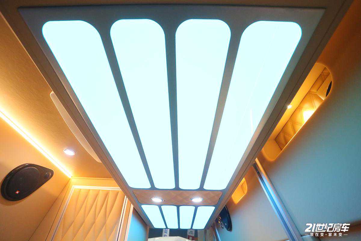 由于B型车内空间有限,虽然车内未配备固定床铺,但除了尾部可拼床座椅外,会客区上方标配一张电动吊床,不仅可独立区分用户睡眠区域,还与下方拼床形成层次形式,使得成员睡眠互不干扰。另外,电动吊床下方顶灯采用八个独立灯条造型设计,夜晚来临时会呈现别致、绚丽夺目的视觉效果。