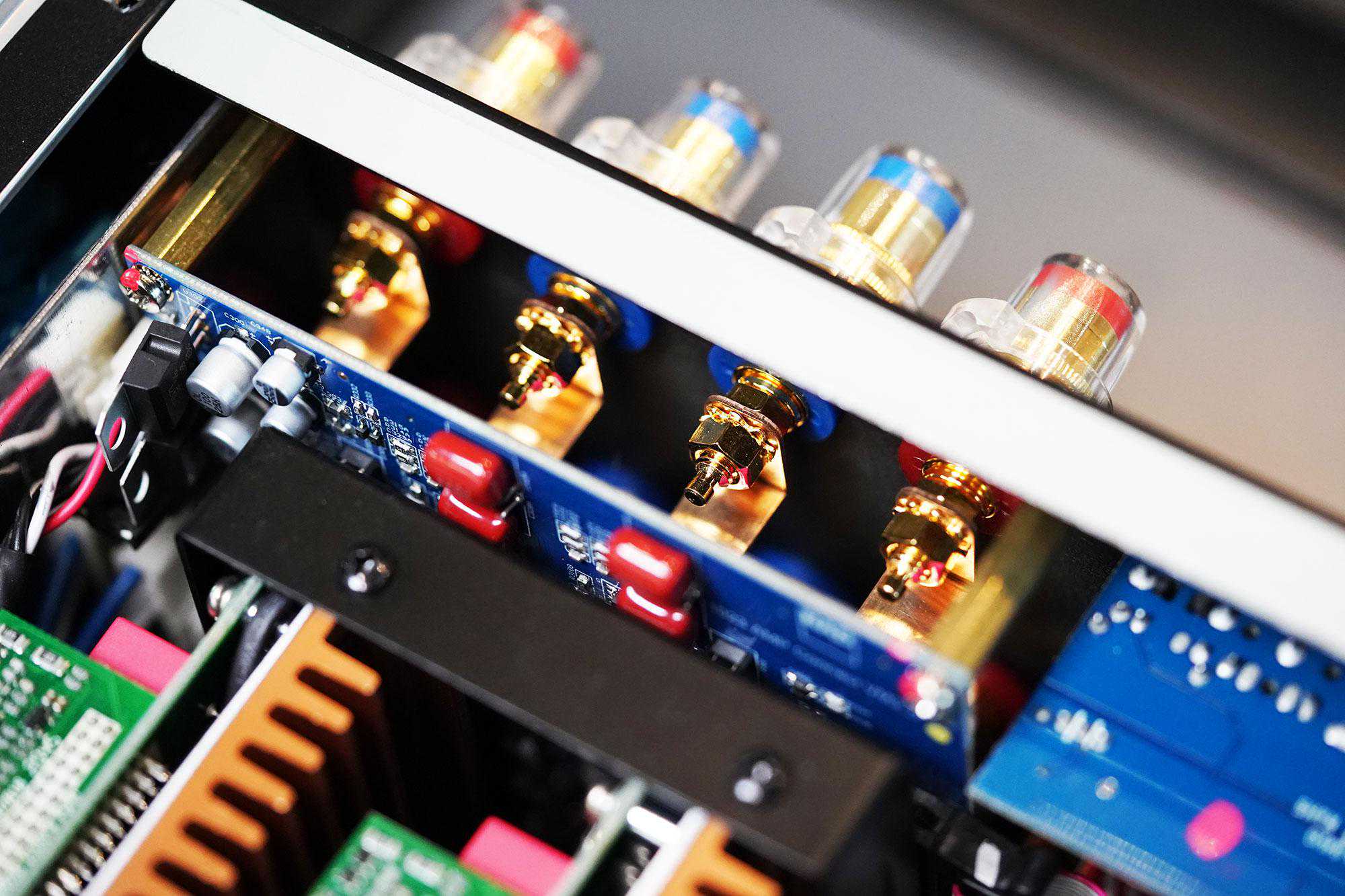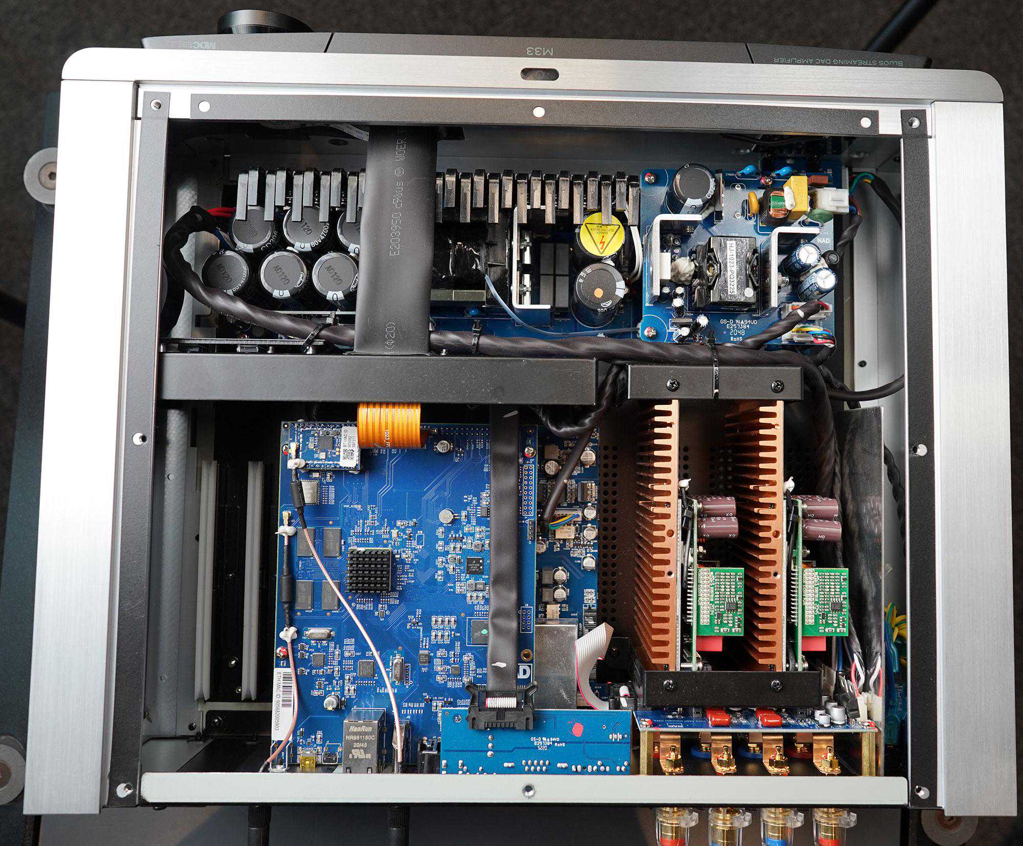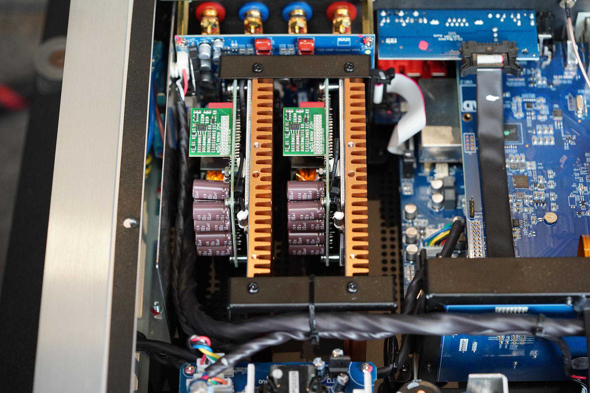 这里面分为了三大块,最重要的当然就是PurifiIET400AEigentakt这一全新的数字放大模块,而最上面靠近前面板的是电源供应,而左边蓝色的PCB是DAC、前级和BluOS系统那一大堆。
