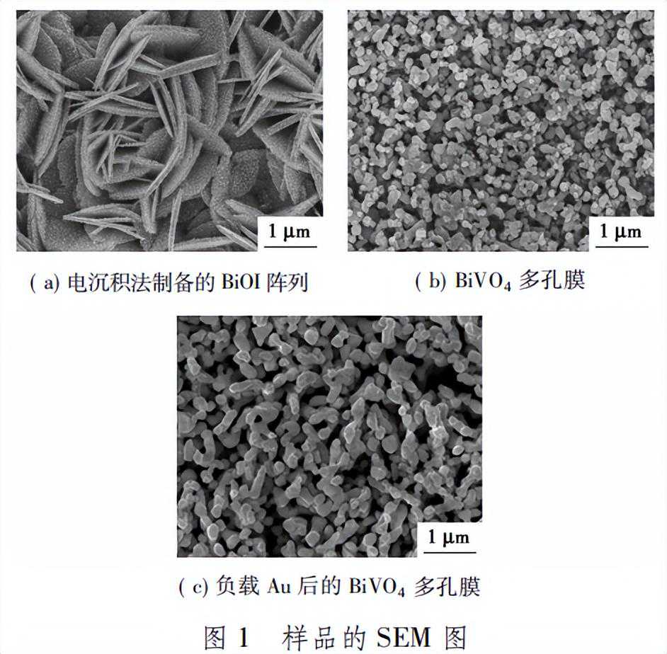 1SEM分析样品的SEM图如图1所示。从图1(a)中可以看出,所制备BiOI样品呈鳞片状交错分布,鳞片尺寸为1~2μm,非单晶体,由众多细小的纳米粒子构成。从图1(b)中可以看出,当引入过量的钒源并经热处理后,BOI可以转化为BiVO4,BiVO4纳米多孔膜是由粒径为200~500nm的纳米颗粒连接而成,该结构使得电极与电解液间有充足的接触区域,从而提供大量的活性位点,缩短了载流子的扩散路径,有利于实现较好的PEC性能。
