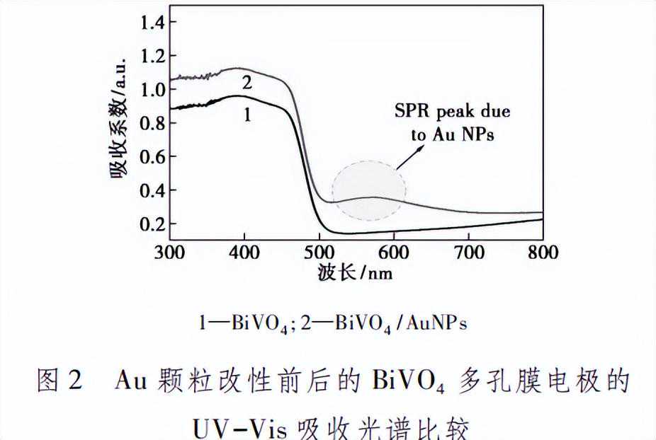 2.2UV-Vis分析Au颗粒改性前后纳米多孔BiVO4电极的UV-Vis光吸收谱图如图2所示。从图2中可以看出,Au颗粒改性能够显著增强样品在可见光区域的光吸收,在550nm附近出现1个显著的吸收峰,与表面等离子激元增强效应(SPR)有关。充分说明表面Au负载有利于样品对可见光的捕获,从而产生更多的光生电荷,有利于取得更好的光电催化性能。