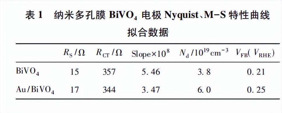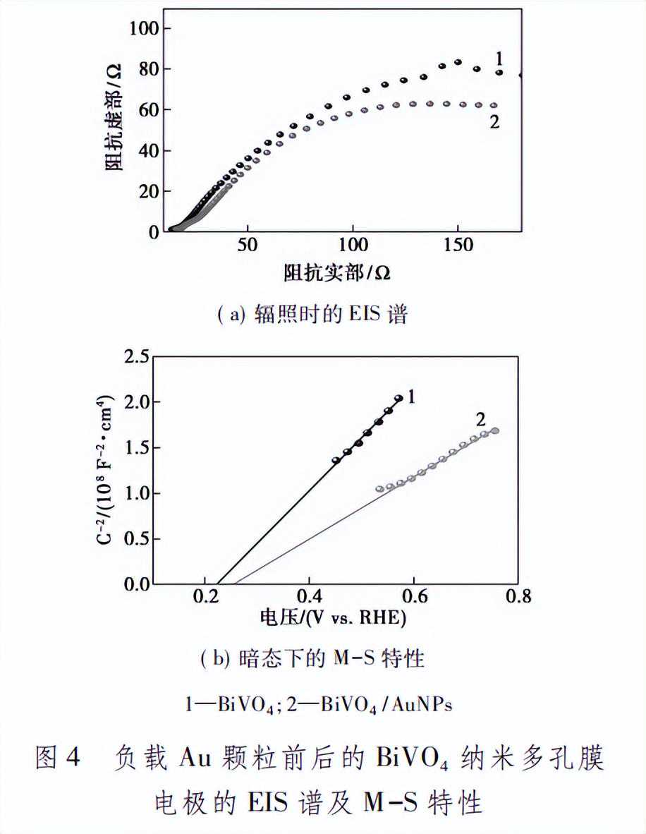 此外,光照瞬间出现一系列光电流衰减的小尖峰,表明电极/电解液界面处存在电荷复合,部分光生电子/空穴对未及时输运而相互复合。负载Au颗粒前后纳米多孔BiVO4电极的Nyquist曲线和M-S特性如图4所示,相应的拟合结果如表1所示。