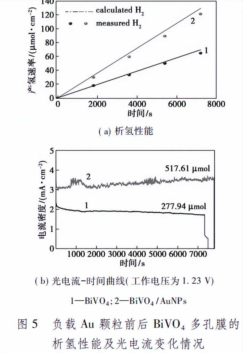 4PEC产氢性能研究结果表明,负载Au颗粒有助于增强BiVO4纳米多孔光阳极的PEC性能,使其光电流由1.34mA/cm2提高到2.46mA/cm2,主要原因在于Au纳米颗粒的表面等离子体效应有利于可见光吸收,并有效降低了电极/电解液界面转移电阻。利用BiVO4作为光阳极构建PEC池,实现了利用可见光分解水制氢,在1.23V电位下的析氢速率为33.2μmol/(cm2·h),法拉第效率达到96.5%。