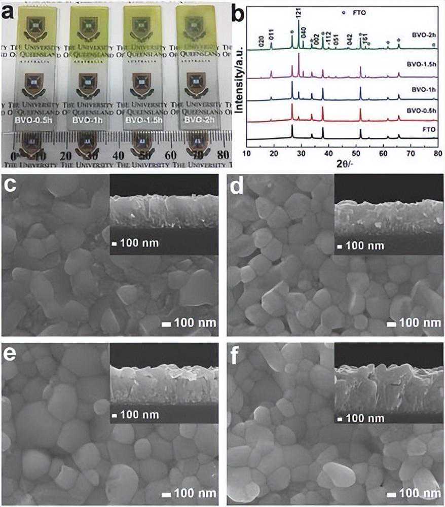采用典型的三电极电池在FTO基底上电沉积10min得到BiOI预制膜,工作偏压为-0.143V(相对饱和甘汞电极)。然后将0.05gVO(AcAc)2溶于1mL的二甲基亚砜中,磁力搅拌至充分溶解。取0.15mL的上述溶液均匀滴涂在BiOI膜上(2cm×2cm),在马弗炉中450℃热处理2h(升温速率为2℃/min)。