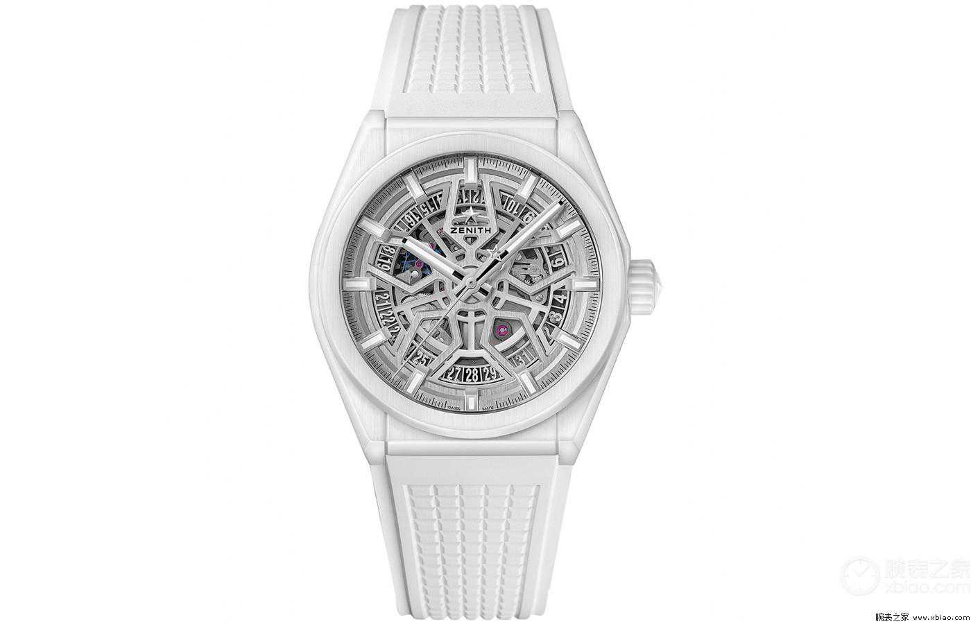 腕表点评:这只腕表,给作者的第一感觉就是:太漂亮了!白色的表带、表壳、表冠,给人的感觉十分高洁,洁白胜雪。腕表直径41毫米,白色陶瓷打造表壳,表冠,银色镂空表盘效果炫酷,时标、指针均覆涂夜光涂层,12点位有真力时的品牌logo,6点位指示日期,调节时可以看到日历环转动。通过背透的设计,可以看到Elite670SK自动机械机芯的自动陀做成了五角星的样子,这枚机芯动储50小时,宝石数27,腕表防水100米。