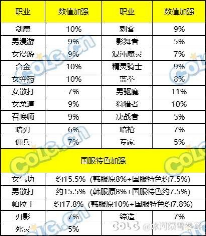 22个职业获得平衡性改动,基础数值和国服特色提升提升参考下图。