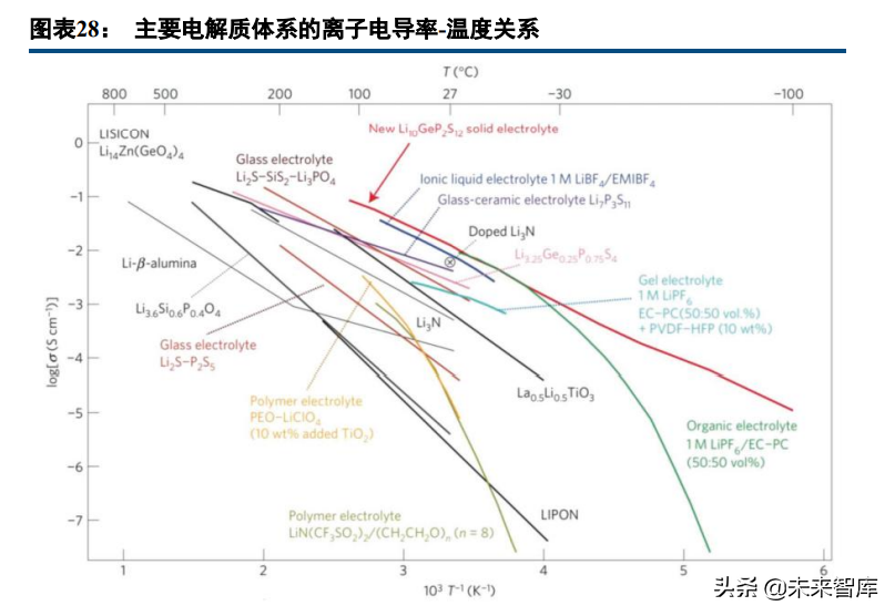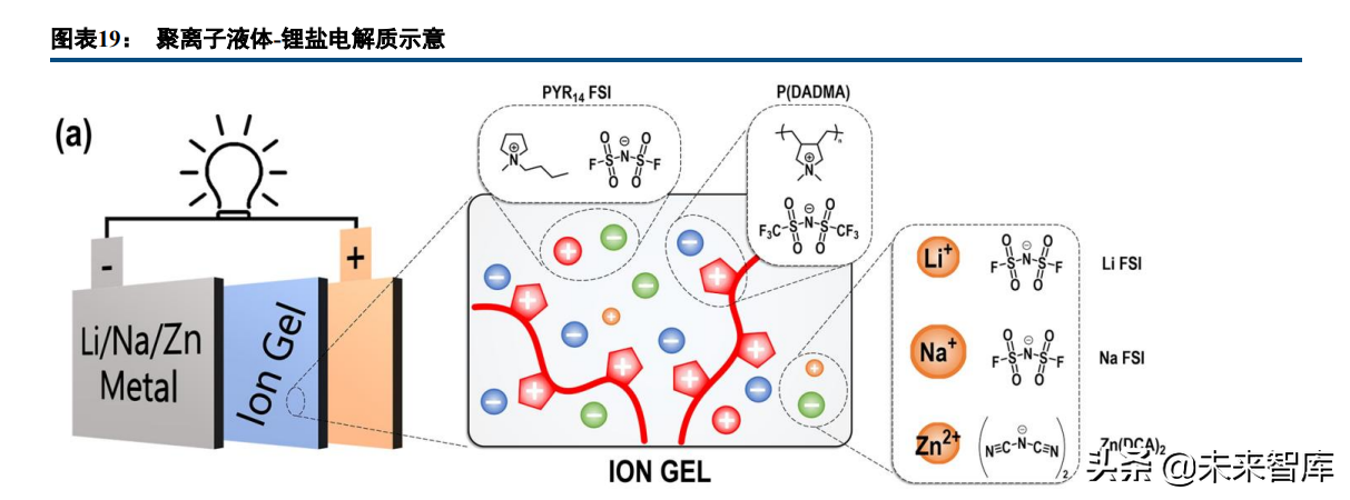 室温熔融盐离子液体热稳定性好、不易挥发、电化学窗口宽(部分离子液体可耐受5V高压)、不易燃、离子电导高,离子液体体系本身也是高性能电解液的重要分支(但其粘度高,浸润电极能力一般,而且昂贵)。聚离子液体加入锂盐后形成的离子凝胶也具备导锂能力。该体系的锂离子电导率提升、综合性能优化与成本降低探索也在进行。