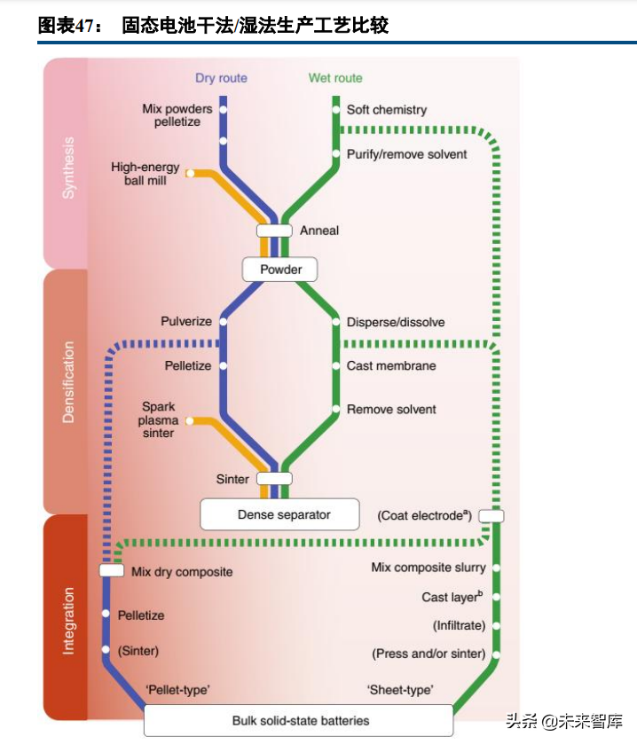 液态电池部分工艺的创新性改进(如干法电极,研究者认为,干法以球磨替代搅拌,以压延替代涂布,并省去了湿法涂布后的烘干过程,可节约溶剂、缩短工时、避免溶剂残留、降低设备复杂度)也在研究过程中。