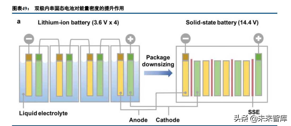 可以看出,充分减薄固体电解质,则三元正极-锂金属电池的体积能量密度表现突出,硫正极-锂金属电池的质量能量密度表现突出,铁锂正极的性能指标变化幅度略小,能量密度也较低。研究者同时归纳,具体到固体电解质本身,聚合物体系较薄的研究成果较多。研究者也论述,固体电解质厚度和强度是一对矛盾,其他性能指标和工艺性的最终实现也都具有挑战性。另外,在电芯设计的层面,全固态电池可以实现双极内串的设计方式,这样还能进一步降低辅助组元的占比,提升电池能量密度。
