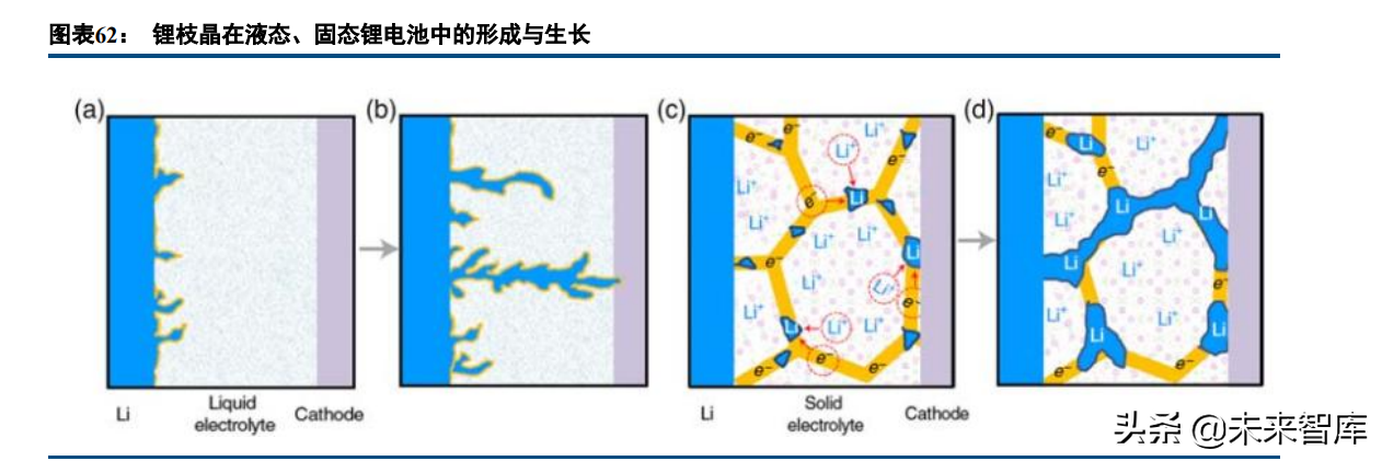 所以我们可以中性预期,在搭配常规正负极电池体系时,固态电池的倍率性能不及液态电池,但是也能够达到可用状态(对常规能量型动力电池而言)。如果负极应用锂金属,那么无论液态、固态锂离子电池,都面临着锂枝晶的考验。对固态电池而言,提升固体电解质材料的锂离子电导、降低电子电导,对固体电解质进行减薄、改善各个界面电接触等等手段都是必要的。