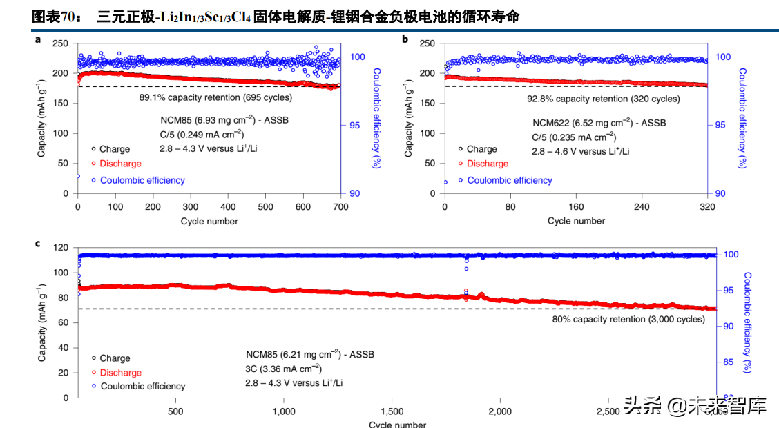 对于相对较新的卤化物固体电解质电池,有研究者合成了Li2In1/3Sc1/3Cl4固体电解质,该电解质搭配钴酸锂或者高镍正极、锂铟合金负极后,在相对高的倍率(2-3C)条件下,还保留了较高的容量,这也体现了卤化物体系的潜力。