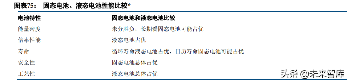 我们把能量、倍率、寿命、安全性和工艺性综合考虑(物料成本暂时难以定量分析,部分体系使用昂贵的化学元素那么前景有限,部分体系使用组成/结构复杂的固体电解质则对成本也有不利影响),固态电池和现有液态电池各有所长。