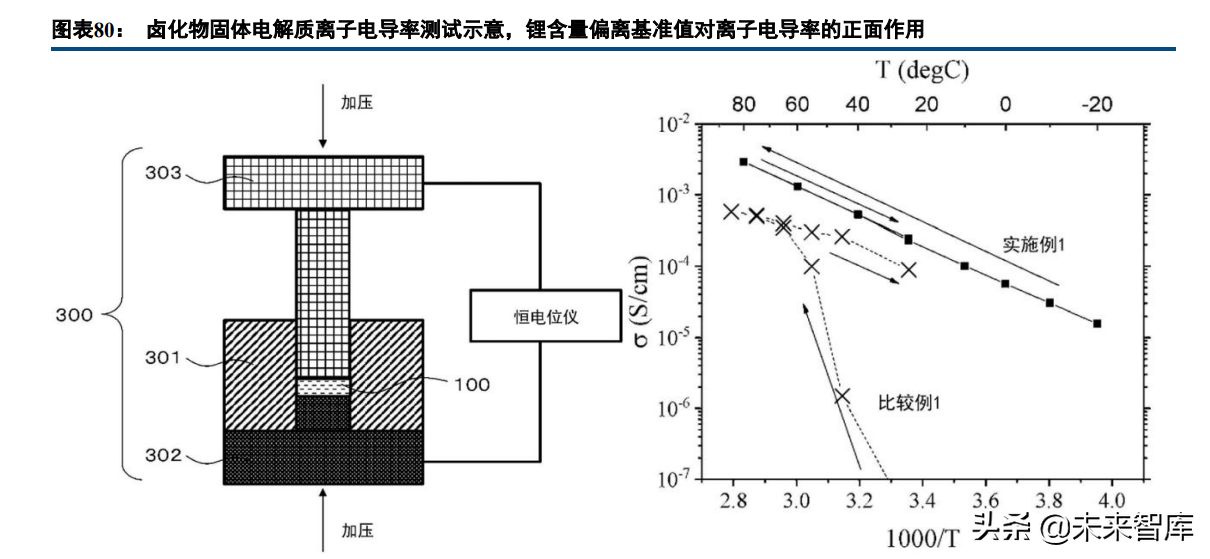 丰田也布局了石榴石固体电解质,见专利CN112952187A、CN109428116A等。丰田还将硫化物、氧化物固体电解质进行复合(氧化物固体电解质还进行了过渡金属掺杂),硫化物固体电解质含量占比足够高时样品才体现出了较高的离子电导率,见专利CN106848389B;在正极(实施例为钴酸锂)表面包覆磷酸锂-硅酸锂纳米层以适配不耐高电压的固体电解质(如硫化物固体电解质)等。但是另外一方面,丰田的专利工作数据公开并不十分详尽,我们关心的固体电解质、电池性能参数大概率有待进一步披露。这不能不说是一个遗憾。松下除了以依托高镍三元正极、硅碳负极的圆柱电池适配特斯拉若干车型在动力电池界享誉外,在固体电解质领域也有相当多的研究工作。授权于2022年的专利CN111316379B研究了卤化物固体电解质LiYCl在锂含量和理论化学计量比有区别的条件下,固体电解质的离子电导率和温度的关系。研究工作显示,适当的Li含量缺失、Y含量增加(实施例对应成分是)可以提升材料的室温离子电导率至10E-4S/cm。当然,样品需要在加压条件下测试;高温对离子电导率的提升也有正面作用。