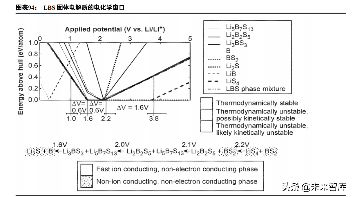 QS还进行了若干硫化物固体电解质基础材料体系的研究,见于专利US20180342735A1,US20200251741A1等。SolidPower公布于2019年的专利WO2019051305A1描述了一类组成为锂硼磷的固体电解质LBS,合成手段是氩气气氛下混合硫化锂、单质硼、单质硫,密闭融化反应,成分可调。研究者认为,该类材料中的部分例子(Li5B7S13)室温离子电导率有望高达10E-2S/cm。该体系的问题是电化学窗口较窄,电压过低或过高的时候分解产物不导锂。
