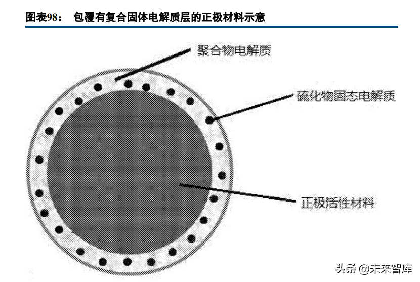 宁德时代还进行了和固体电解质复合的正极材料体系研究、无机电解质和锂盐复合的研究等,见于专利CN111864205A、CN112117485A等。比亚迪获授权于2021年的专利CN109728339B描述了聚合物体系的固体电解质及对应固态电池的制备方法。从实施例看,聚合物是聚偏氟乙烯-六氟丙烯-丙烯酸羟基酯,添加锂盐LiTFSI和填料二氧化硅,进行液相偶联,最后干燥成膜。该固体电解质可以搭配铁锂、钴酸锂等。固体电解质的室温离子电导率在10E-4S/cm。获授权于2017年的专利WO2017128983A1描述了在正极颗粒表面包覆硫化物-聚合物复合电解质的方法。从实施例看,研究者首先制取硫化物(种类多样)-聚合物(种类多样,添加LiTFSI)乳液,再加入正极材料(种类多样,甚至使用了高电压的镍锰酸锂)分散均匀,再涂布、烘干即可得到正极极片。后续可以搭配硫化物固体电解质及锂箔,得到全固态锂电池。研究者认为,进行固体电解质包覆后,电池的阻抗得到有效降低。