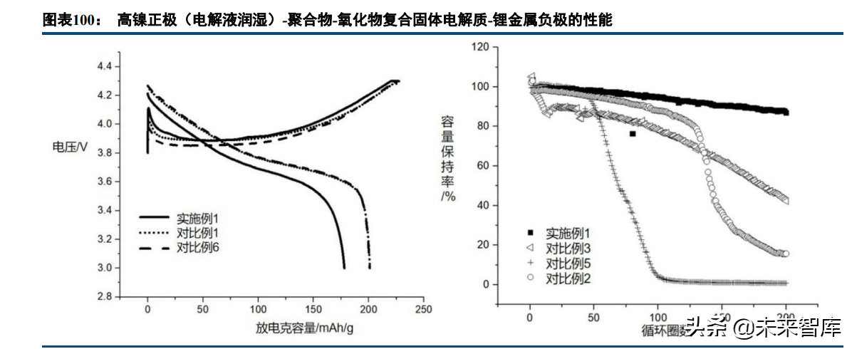 获授权于2020年的专利CN109428053B思路类似,未使用聚合物固体电解质,只用硫化物固体电解质和正极复合。另外,比亚迪对NASICON氧化物固体电解质也有研究,见于专利专利WO2016206430A1。赣锋锂业公布于2020年的专利CN112151858A描述了以氧化物固体电解质为基体,加入粘结剂、增塑剂流延成固体电解质膜的方法,不同类型的氧化物固体电解质膜可以复合。最后得到的固体电解质膜的离子电导率在10E-4S/cm。授权于2020年的专利CN109768330B描述了凝胶态电池的制备方法。该电池包括钴酸锂、PVDF和硫化锂复合的正极,石墨和硫化锂复合的负极,6F电解液和PVDF混合的凝胶态固体电解质,还需要二次注液和热压、冷压。实施例显示,该类型电池1C倍率500次循环后容量保持率超过90%,可以通过过充测试,2C放电容量和0.2C放电容量接近。