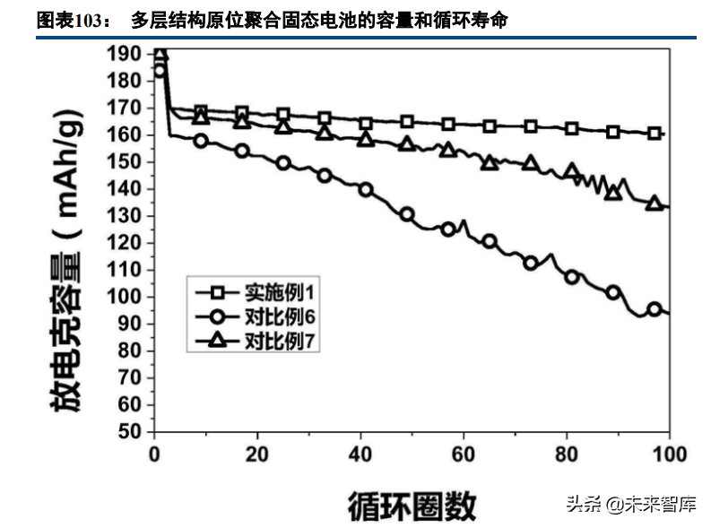 公布于2022年的专利CN114335716A描述了包含正极侧原位形成的耐氧化聚合物层和负极侧原位形成的耐还原聚合物层的多层结构原位聚合固态电池。研究者认为,将通过化学反应能形成耐氧化聚合物的单体或引发剂,在混料过程预置到正极极片;将通过化学反应能形成耐还原聚合物的单体或引发剂,在混料过程预置到负极极片,然后再将与之反应的单体以注液方式注入电池内部,引发聚合反应,达到电池内部原位聚合形成正极耐氧化、负极耐还原的多层结构电解质,可以提升原位聚合电池的安全性和循环稳定性,减小电池内电解质和电极的界面阻抗,方法简单易于扩大生产。从实施例看,正极侧除高镍三元材料、NMP、PVDF外,添加少量聚碳酸酯二醇或马来酸酐;负极侧除石墨、NMP、PVDF、导电碳黑外,还添加聚乙二醇或LiTFSI、LiFSI;原位固化混合液组分为甲苯二异氰酸酯(TDI)-二甲醚(DME)-LiTFSI等。实施例对应的电池正极0.1C比容量约190mAh/g,0.3C比容量接近170mAh/g,循环100周容量保持率基本在95%以上。
