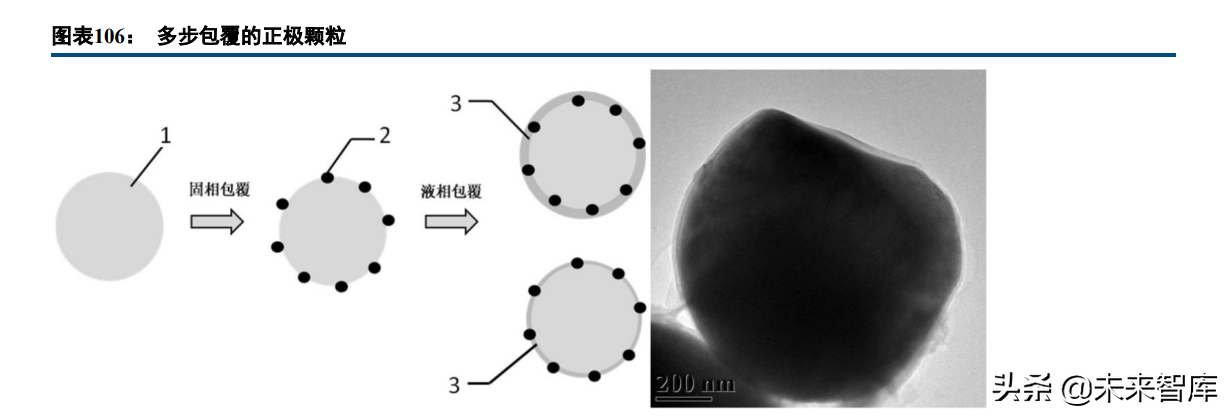 贝特瑞公布于2019年的专利CN109659507A描述了固体电解质包覆正极材料的方法。其工艺流程是,砂磨固体电解质原料得到浆料;混合砂磨浆料和和正极,得到前驱体浆料;喷雾干燥浆料得到前驱体;煅烧前驱体,得到包覆有固体电解质的正极。从实施例看,固体电解质包覆层为LATP,由碳酸锂、氧化铝、二氧化硅、磷酸二氢铵反应得到;正极基体是高镍三元材料。最终实施例的循环寿命、倍率性能均优于对比例。