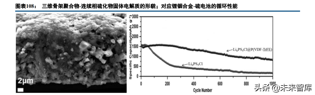 被授权于2022年的专利CN113451638B描述了具有三维骨架结构的聚合物膜和形成连续相的硫化物固态电解质材料的硫化物固体电解质,及对应电池。研究者认为,利用柔性聚合物膜作为骨架支撑作用,硫化物在聚合物膜中形成连续相,保证了硫化物固态电解质膜的离子电导率(约10E-4S/cm),大大降低了固态电解质膜的厚度(至约40微米)。从实施例看,硫化物连续相是LPSCl,聚合物是聚偏氟乙烯-三氟乙烯,搭配硫-碳纳米管正极-锂铟合金负极后仍有较高的循环寿命。