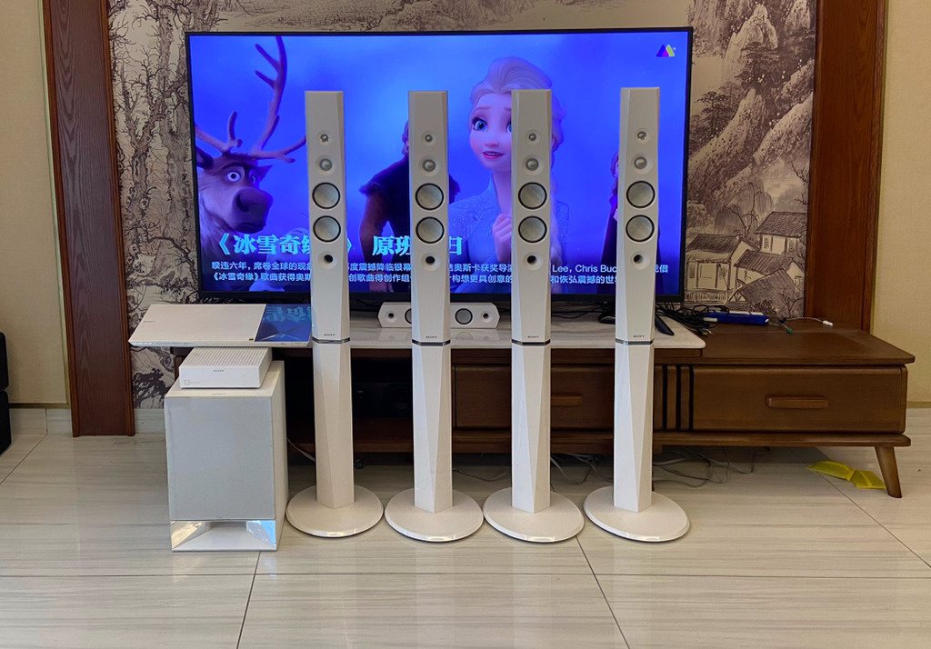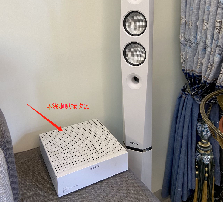 如果你家里已经装修好了,没有预埋环绕线,但又不想影响美观,可以用无线的环绕音响,例如我之前索尼的那套BDV-9200WL,但是需要在后面放一个无线接收器,是需要有插座供电才能工作。
