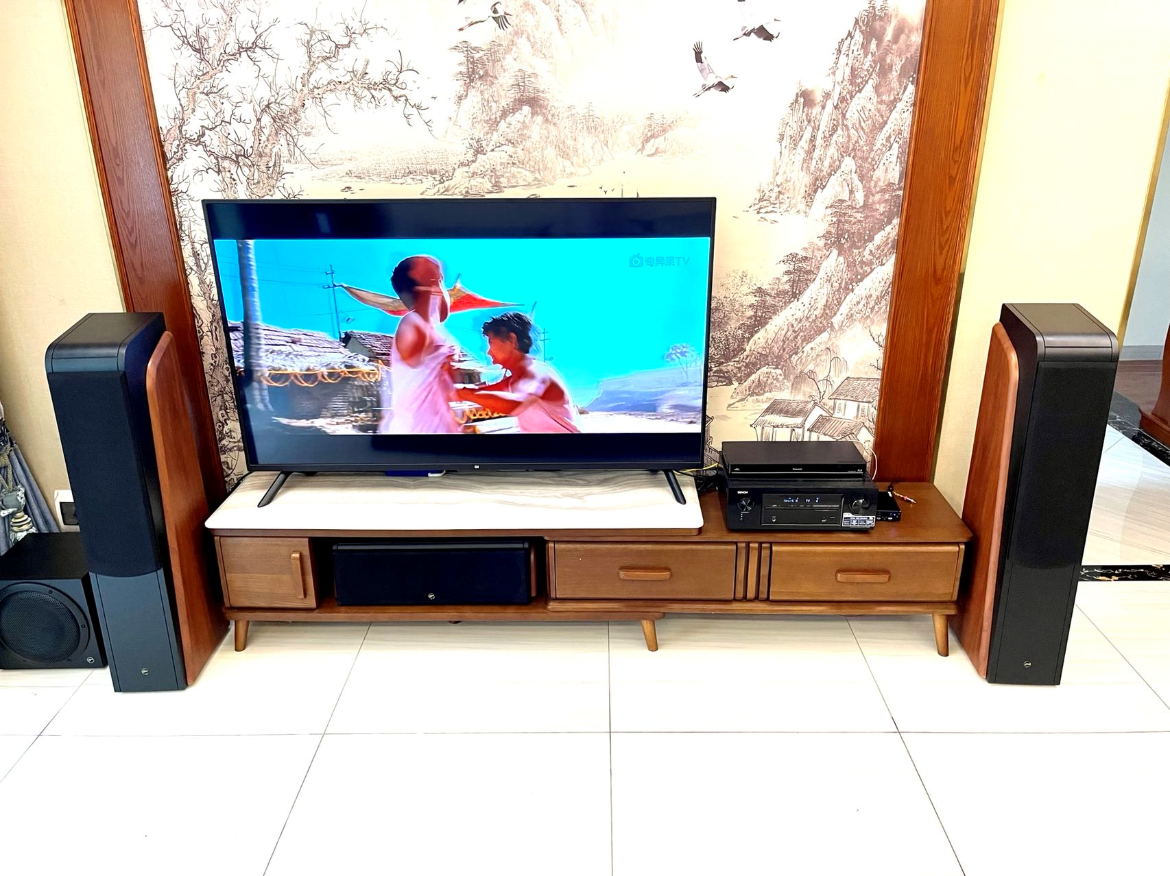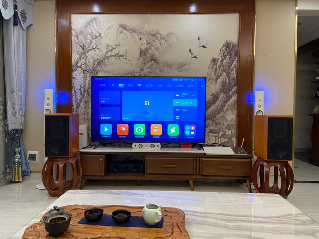 因最近给自己家升级了一套惠威的的家庭影院音响效果极棒,先来个全家福,左、右声音主箱、低音炮、中置、左、右环绕都在了,环绕箱放在了沙发旁边,正面整体的效果还是很棒的,实际效果要比这手机拍的照片好很多。