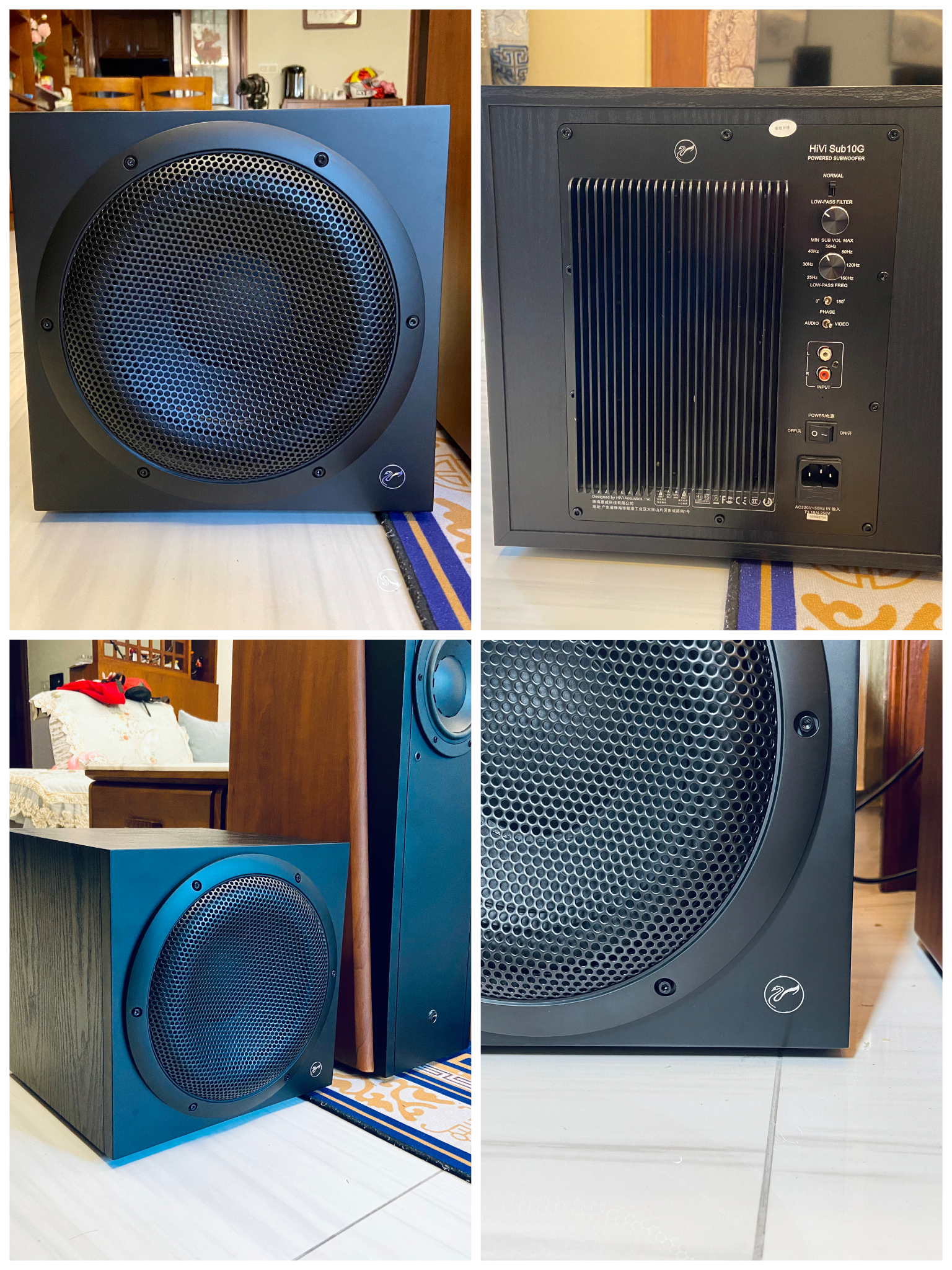 我们平时在电影院里看大片时特别震撼的声音就是低音效果,我们一般的家庭影院都是用单独的低音炮来表现。惠威这套配的是10寸的被动辐射式Sub10G密闭气垫式大功率低音炮,别看它个头小,实际重量将近40斤,和我原来12寸那个一样重,而且低音力度、细节以及饱满程度都要比原来12寸的出色。整套搭配起来更加身临其境的低频爆棚效果。