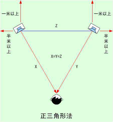 在音乐会现场,观众原本就是坐在台下的,乐队和唱歌的人都是在舞台上的,好的HIFI立体声设备可以再现的这种简单的声场方位感与现场音乐会的方位感,所以一般欣赏音乐的发烧友都是听的立体声。如果是想欣赏音乐的话,就只需要一对音箱即可,摆放位置可以参照上图摆放。