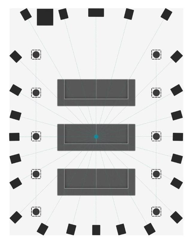 上面讲的,用锅烧出来的五菜一汤,就是基于声道的传统5.1和7.1的音轨格式。而神奇的机器,就是基于对像的全新格式,像现在的杜比ATMOS和DTSX都是这样的技术。并且,7.1.4这样的格式也才仅仅只是起步。随着家庭影院功放的进步(盘子增加),他可以把声音分配到更多的声道。下面,我们放上杜比全景声,最常见的几种摆位图。